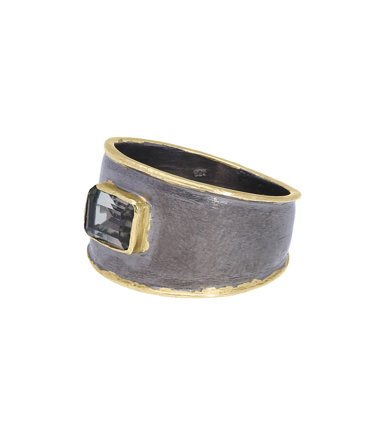 Bague chevalière Jaimie signée 5 Octobre, réalisée en or 14k et argent noirci, dont le centre est orné d'une pierre tourmaline de couleur rose, taillée en rectangle et facettée. Un bijou empreint de préciosité qui apportera une touche rock ou baroque à vos compositions de bijoux.