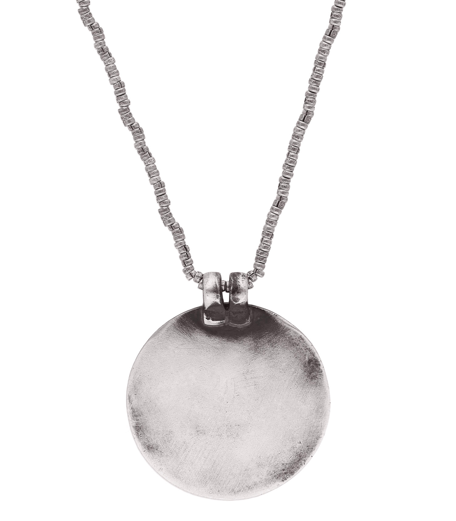 Sautoir Sharp 5 octobre entièrement réalisé en argent 925 patiné. Ce sautoir long se compose d'un fil argémenté de petites perles plates argentées et est orné d'un large pendentif type pièce plate, brossée et patinée pour un rendu vieilli, authentique et brut. Une pièce empreinte de caractère idéale pour accessoiriser une blouse fluide. Un mini pompon en fil lurex argenté et une pastille en argent viennent s'ajouter au niveau du fermoir.