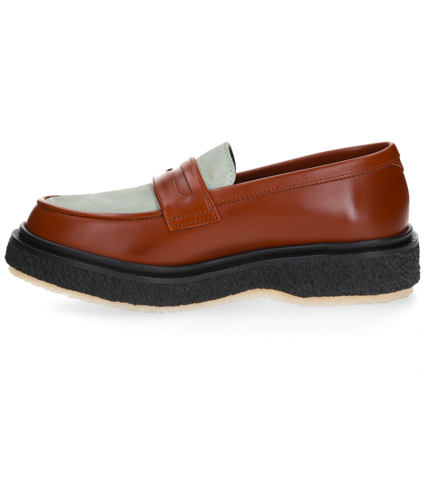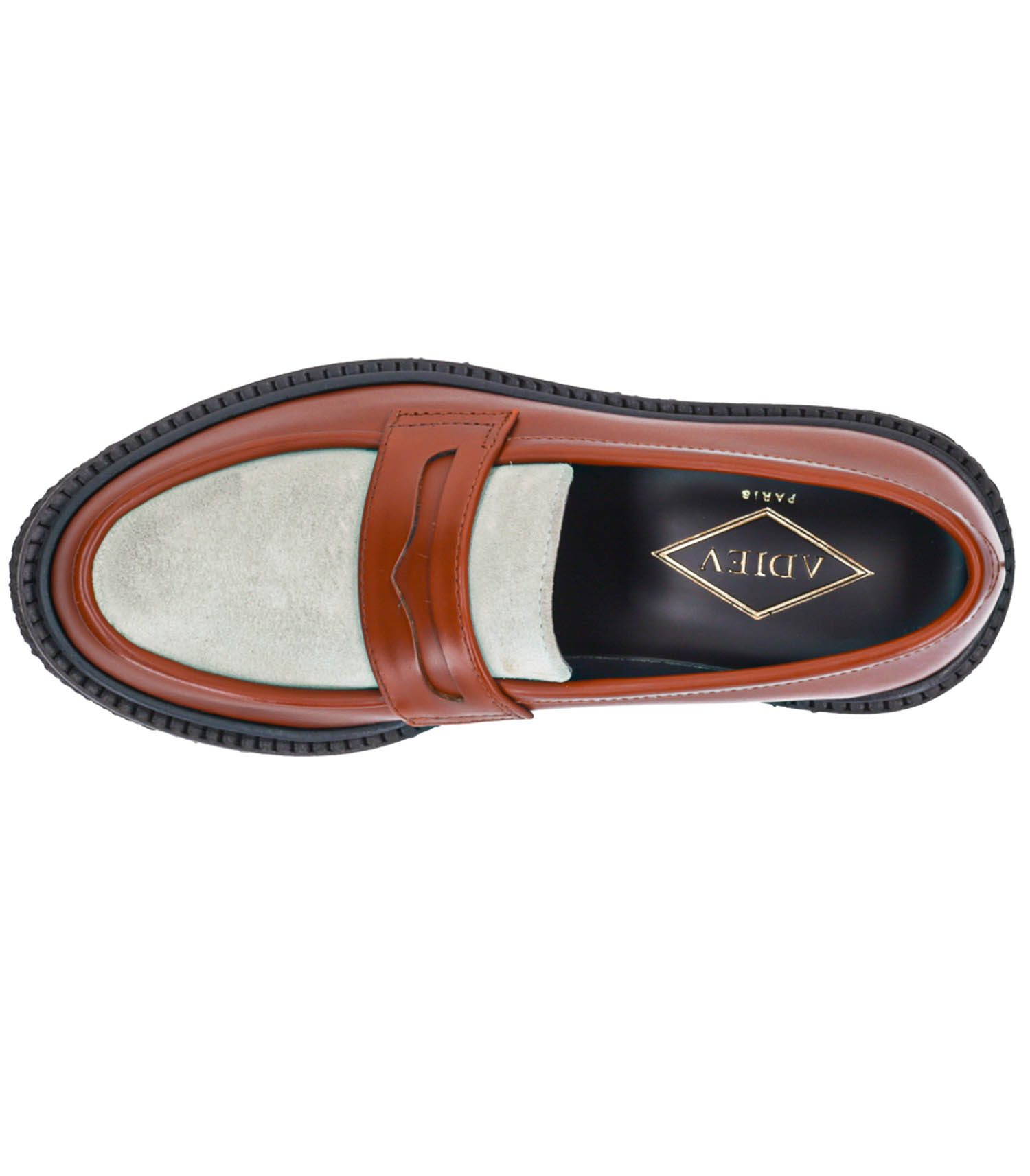 Mocassins bicolores signés ADIEU. Le modèle Type 5 est conçu en cuir lisse couleur rouille réhaussé d'un dessus en cuir suédé vert pâle. Une touche originale apposée sur un modèle classique que l'on porte avec tout, toute l'année.