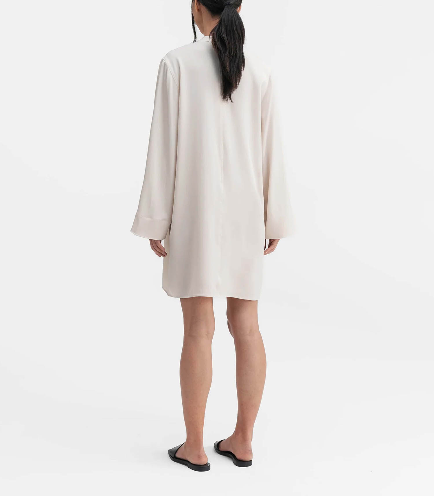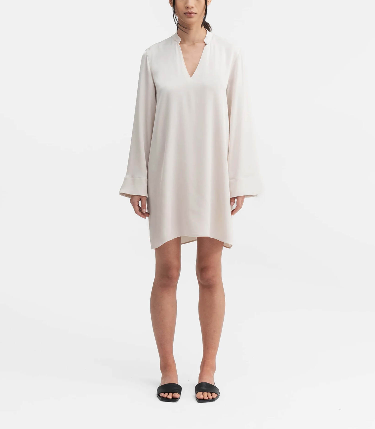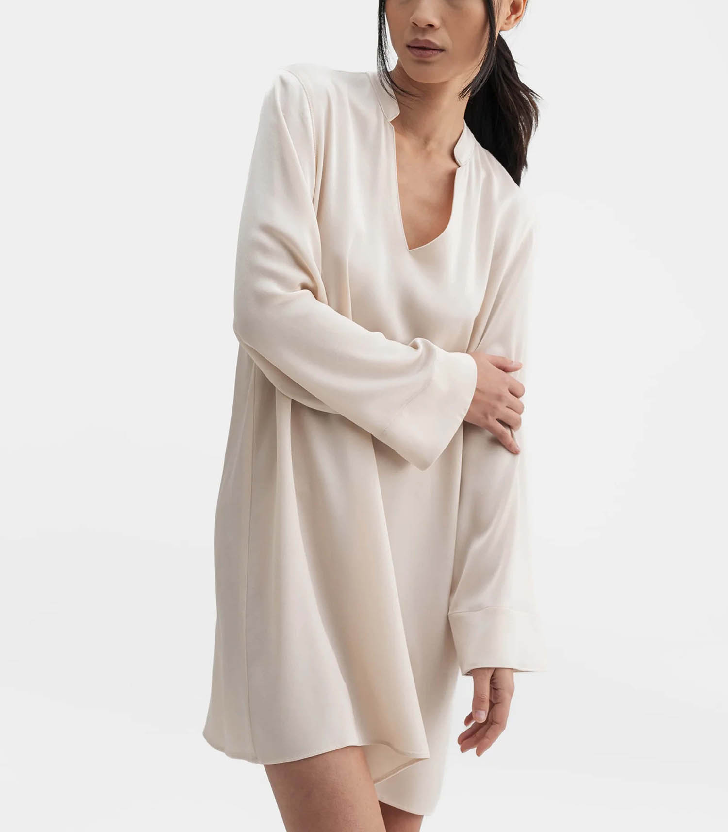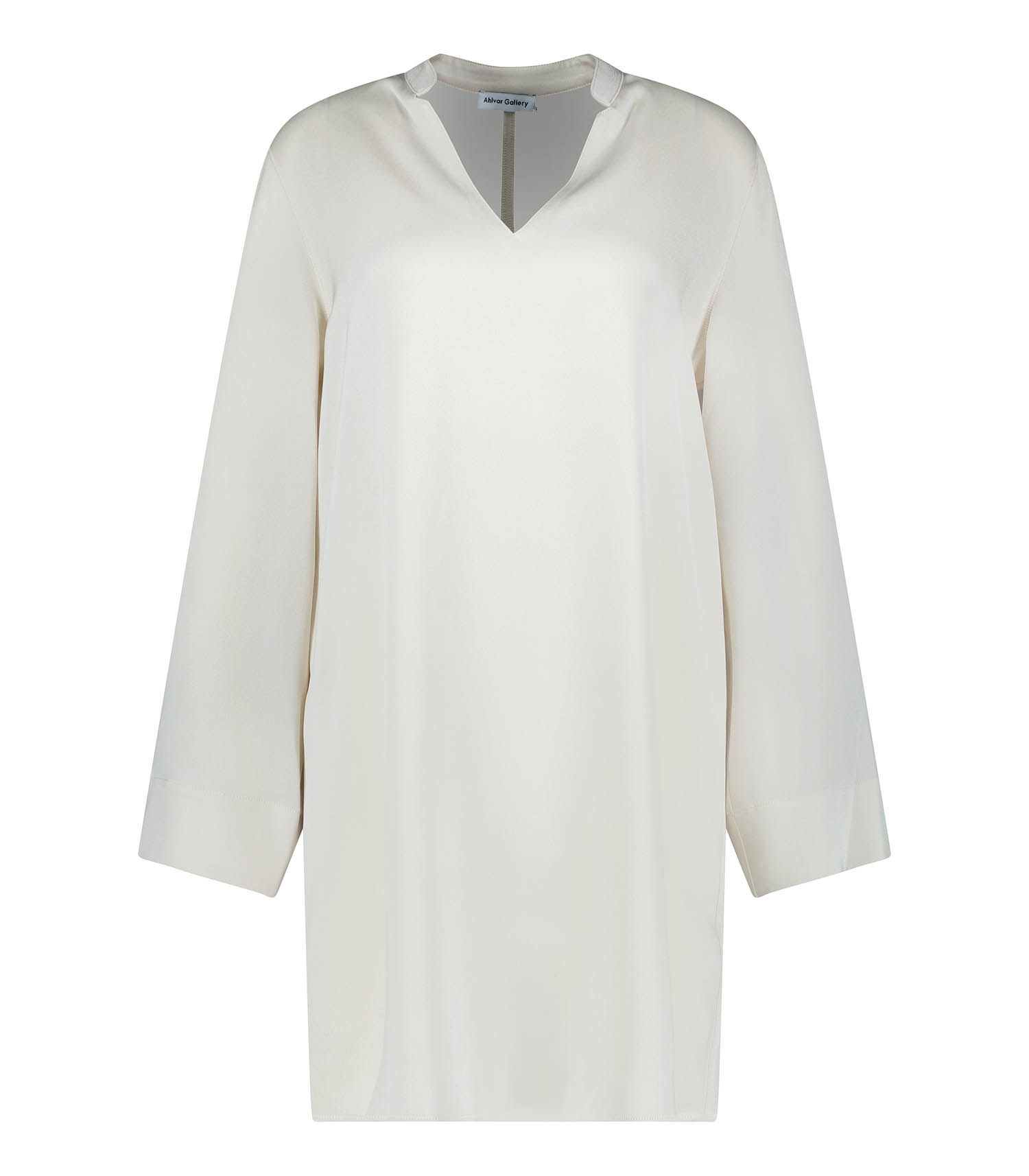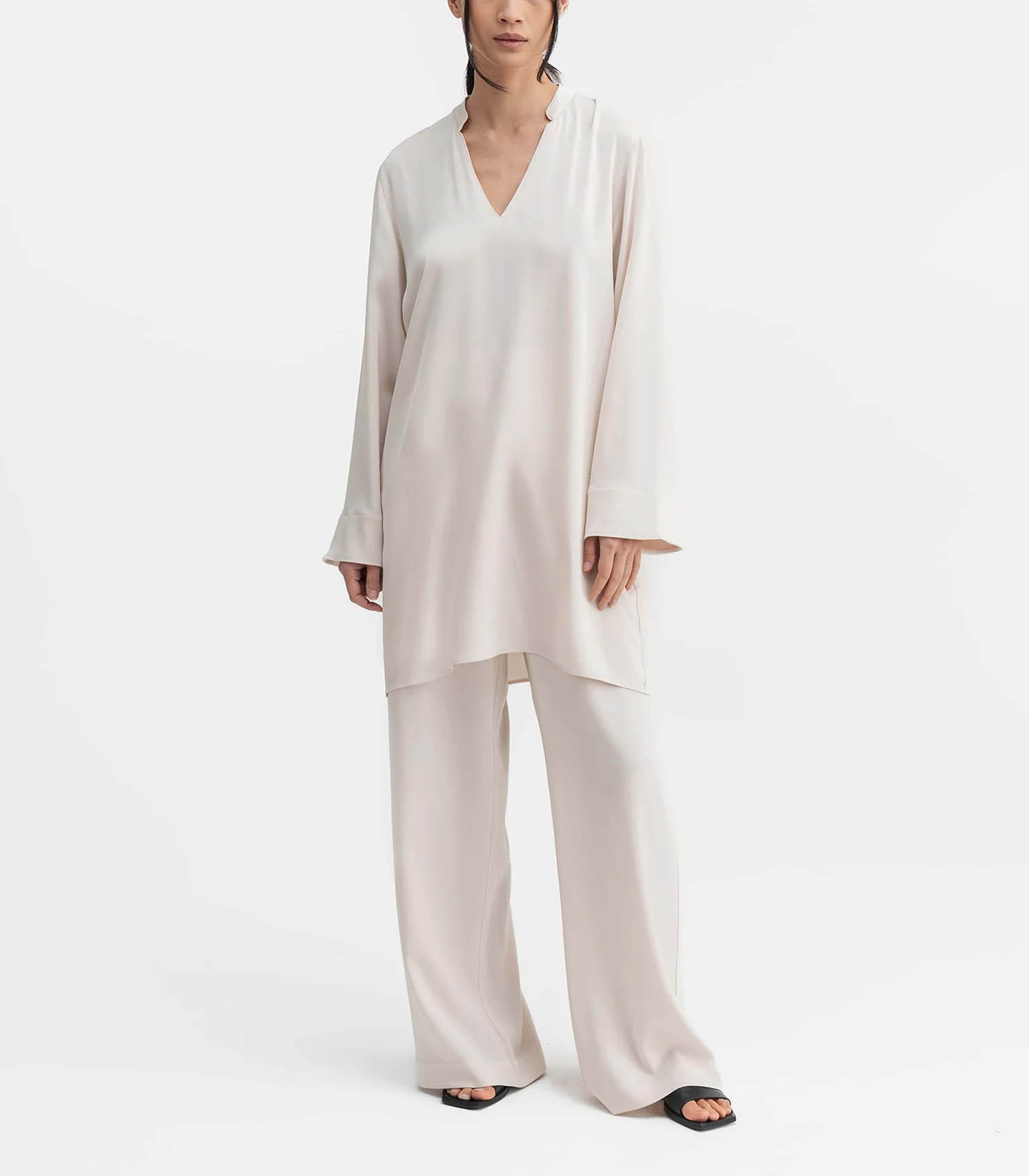 Fluide, ample et élégante, cette tunique Lila présente une encolure en V avec un petit col chinois. Sa coupe est évasée ainsi que ses manches pour donner une forme volante et décontractée. Le dos est décoré d'une couture brodée le long de la colonne vertébrale.