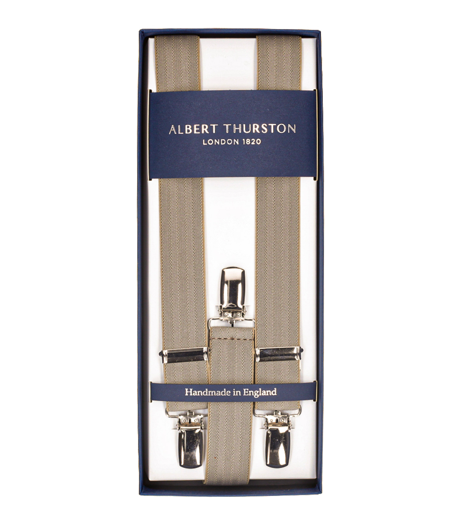 Bretelles Elastic Clip Beige de la marque Albert Thurston, idéales pour succomber à la tendance vintage. A la fois fonctionnelles et tendances, on porte ces bretelles unisexes avec un pantalon carotte et un léger pull à manches longues.