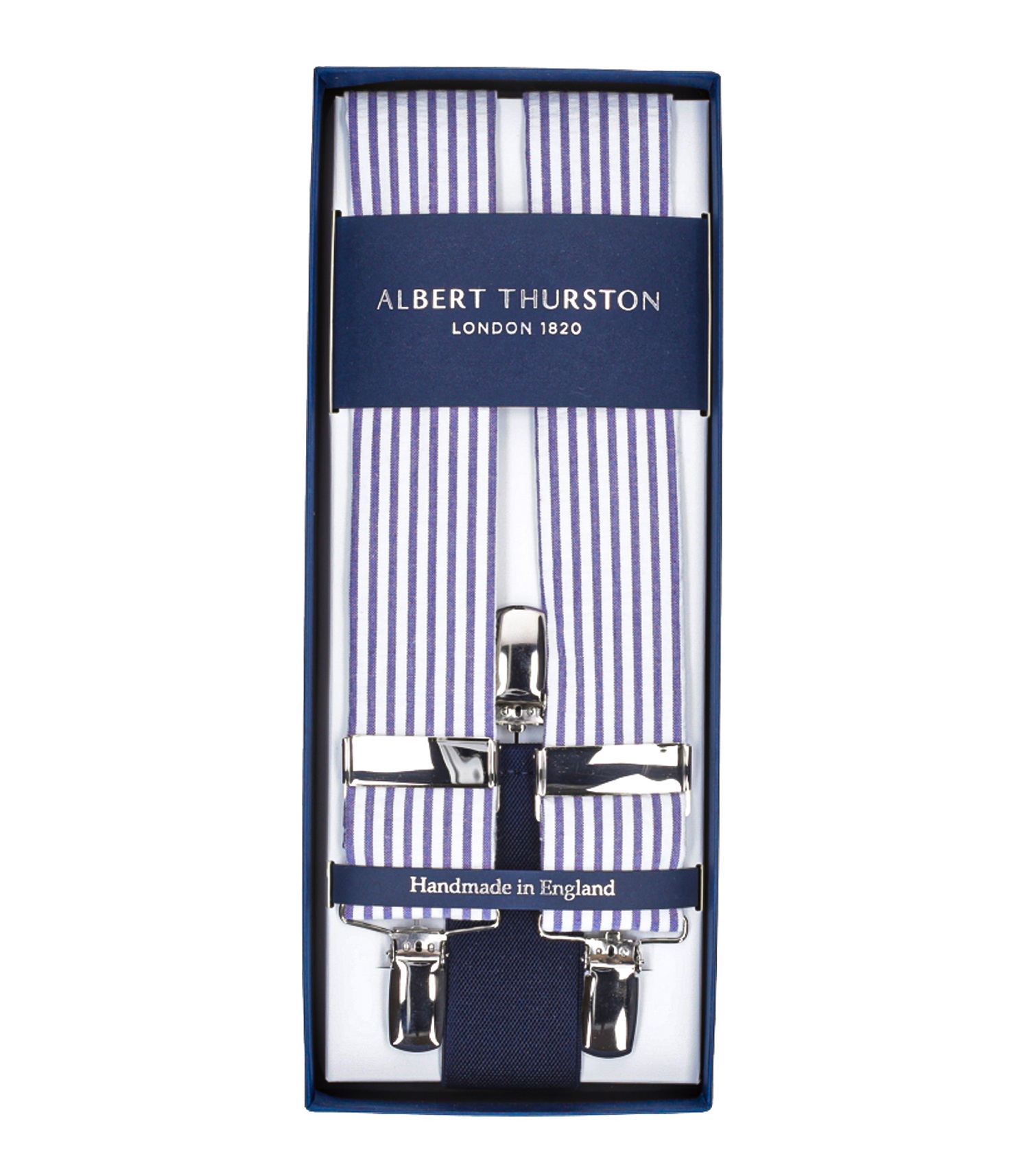 Bretelles Sutting 3 Clip à rayures bleu et blanche de la marque Albert Thurston. Idéales pour apporter une touche vintage à sa tenue, ces bretelles unisexes sont à la fois fonctionnelles et tendances. On les porte avec un pantalon carotte et un léger pull à manches longues.