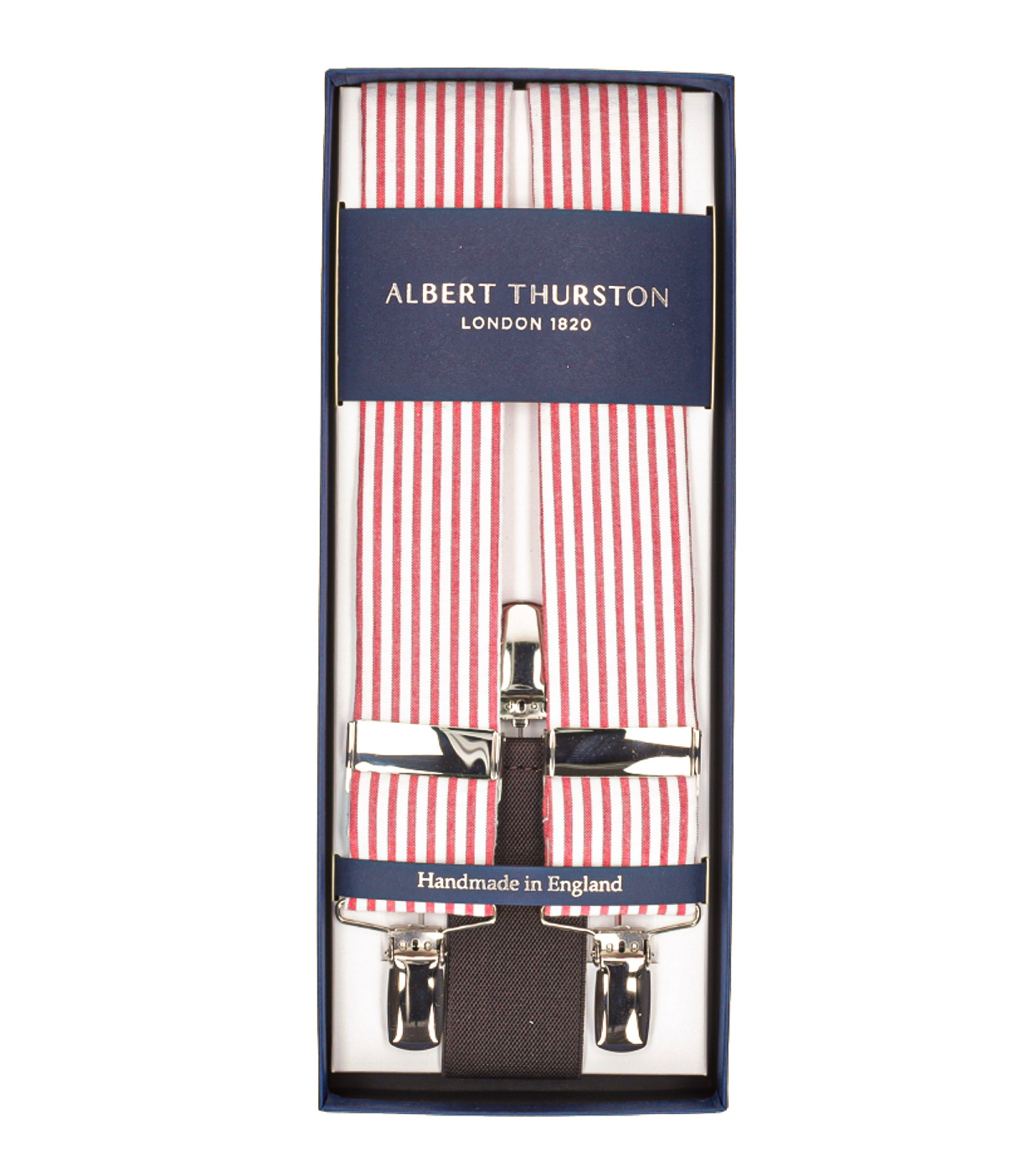 Fonctionnelles et tendances, les Bretelles Sutting 3 Clip à rayures rouge et blanche de la marque Albert Thurston redonnent à cette pièce vintage ses lettres de noblesse. Unisexes, on les porte avec un pantalon carotte et un léger pull à manches longues.