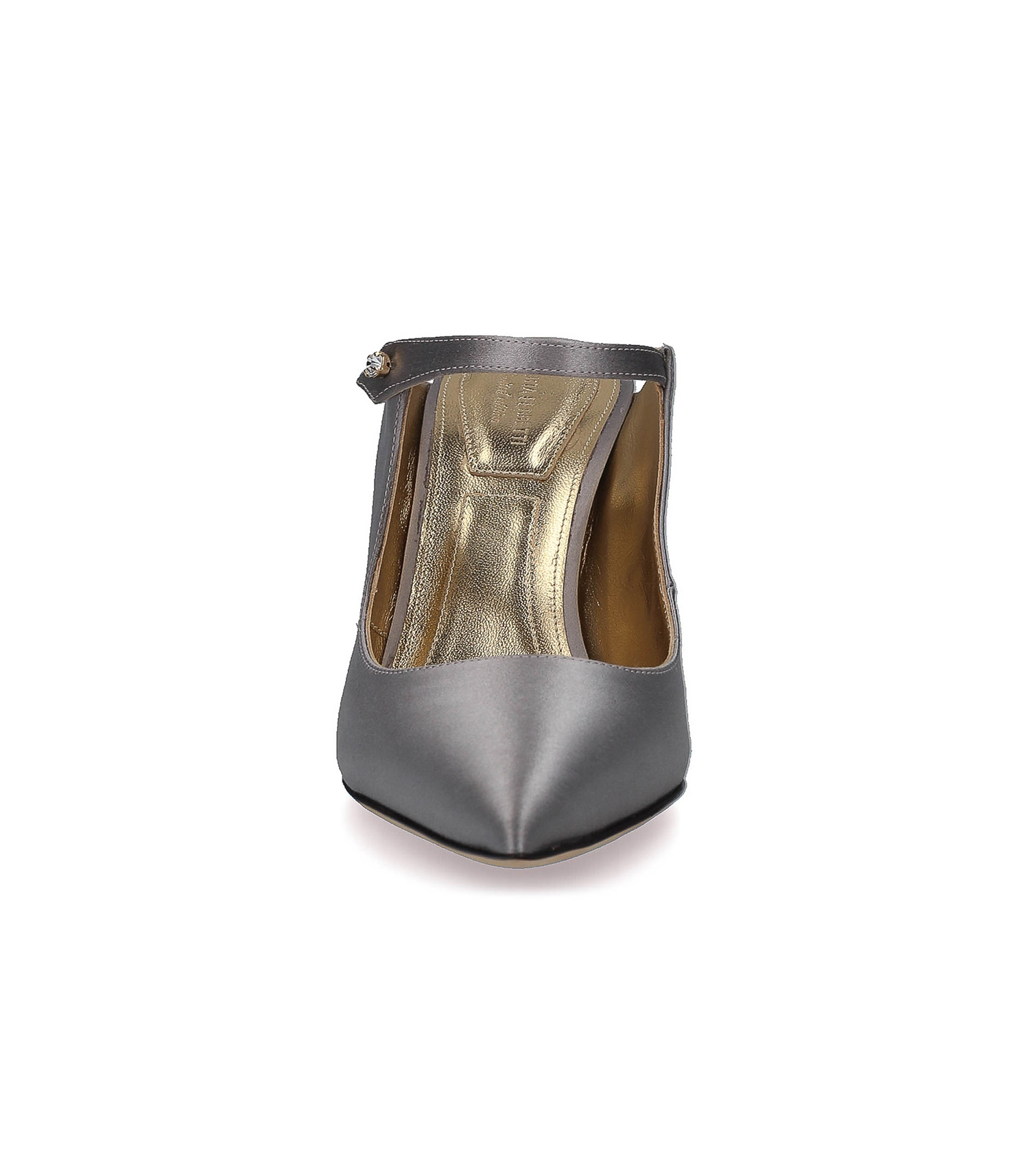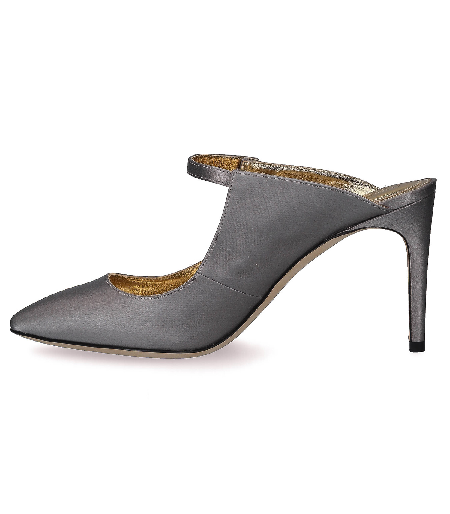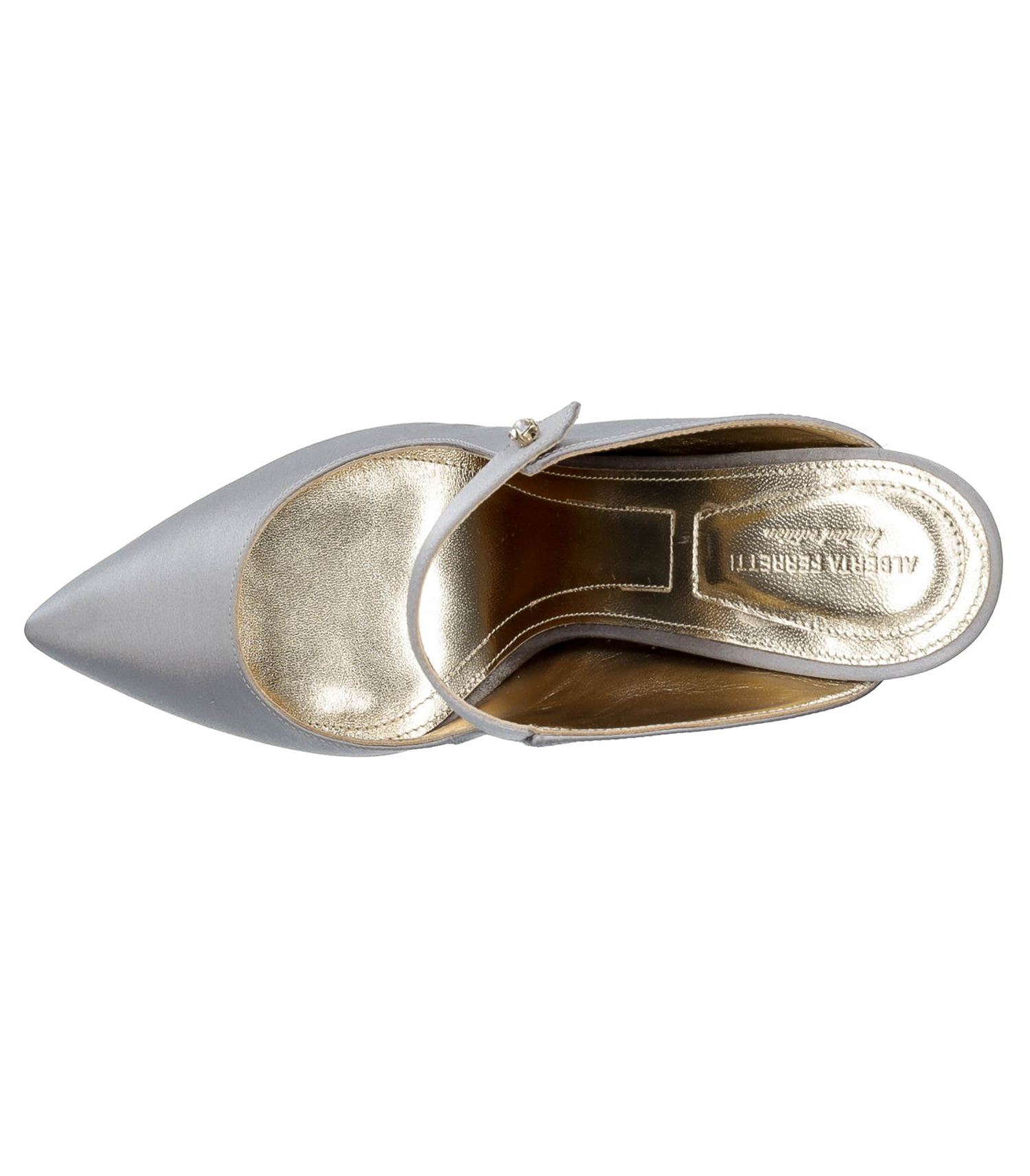 Les mules à talon en soie argentées d’Alberta Ferretti s’accorderont avec un tailleur pour un rendez-vous professionnel ou avec une robe de cocktail pour une occasion moins formelle.