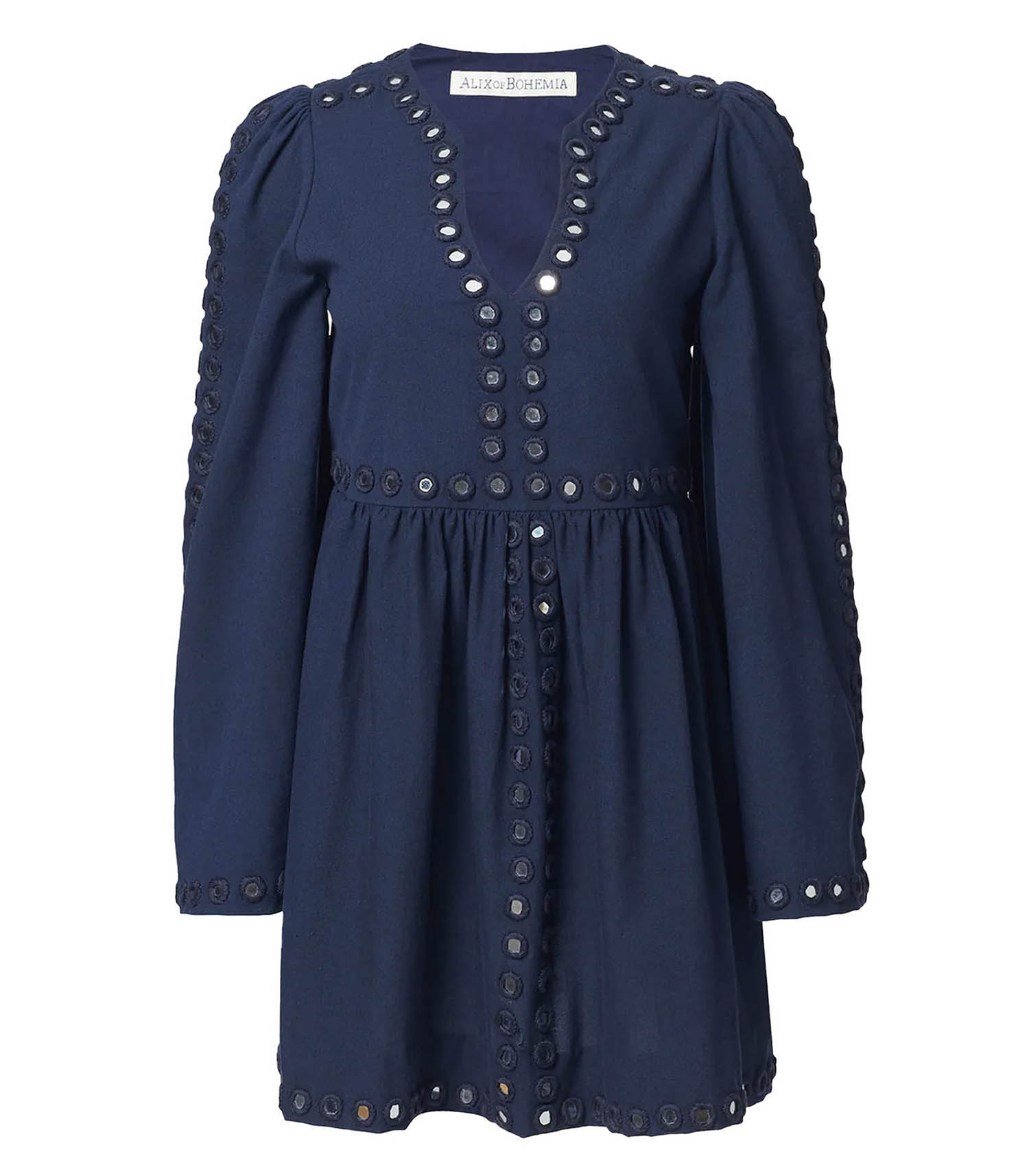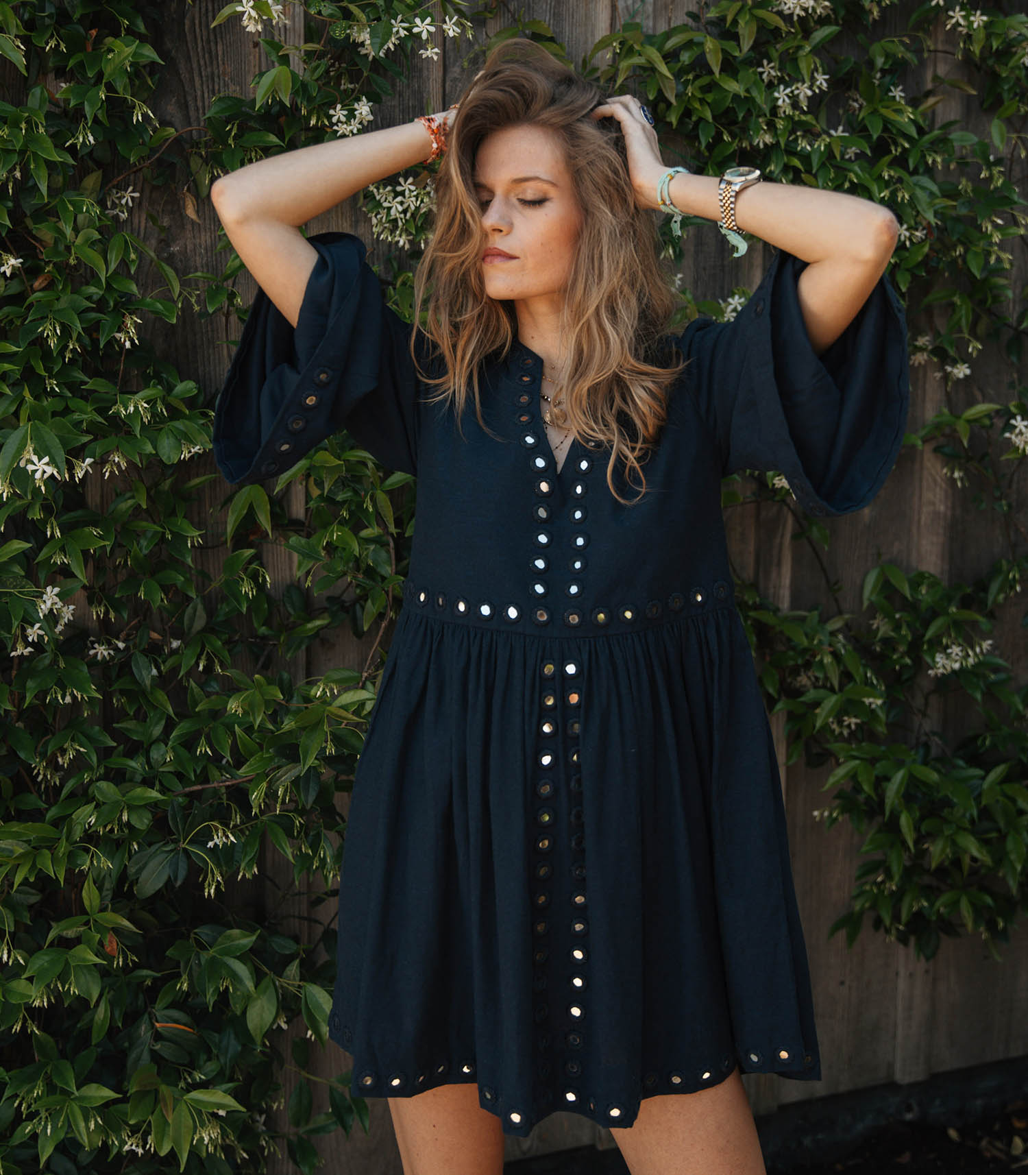 Robe Silvie Midnight Mirror signée Alix of Bohemia, confectionnée en coton Khadi. Cette pièce élégante et bohème possède de gracieuses manches cloche avec de petites épaulettes pour le volume, et une jupe courte froncée. L'enclure bateau s'ouvre sur une fente élégante à la poitrine. Entièrement brodée à la main, elle est travaillée avec de nombreux petits miroirs ronds sur les bordures. Entièrement doublée au niveau du corsage et finie à la main.