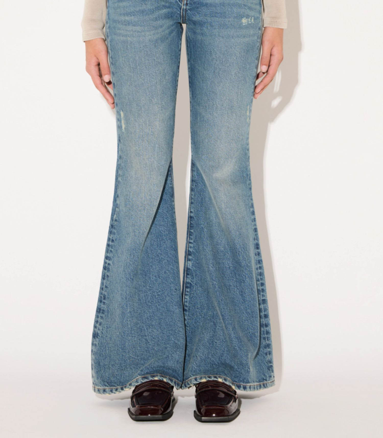 Sa coupe est évasée (flared), apportant une silhouette allongée et fluide.
