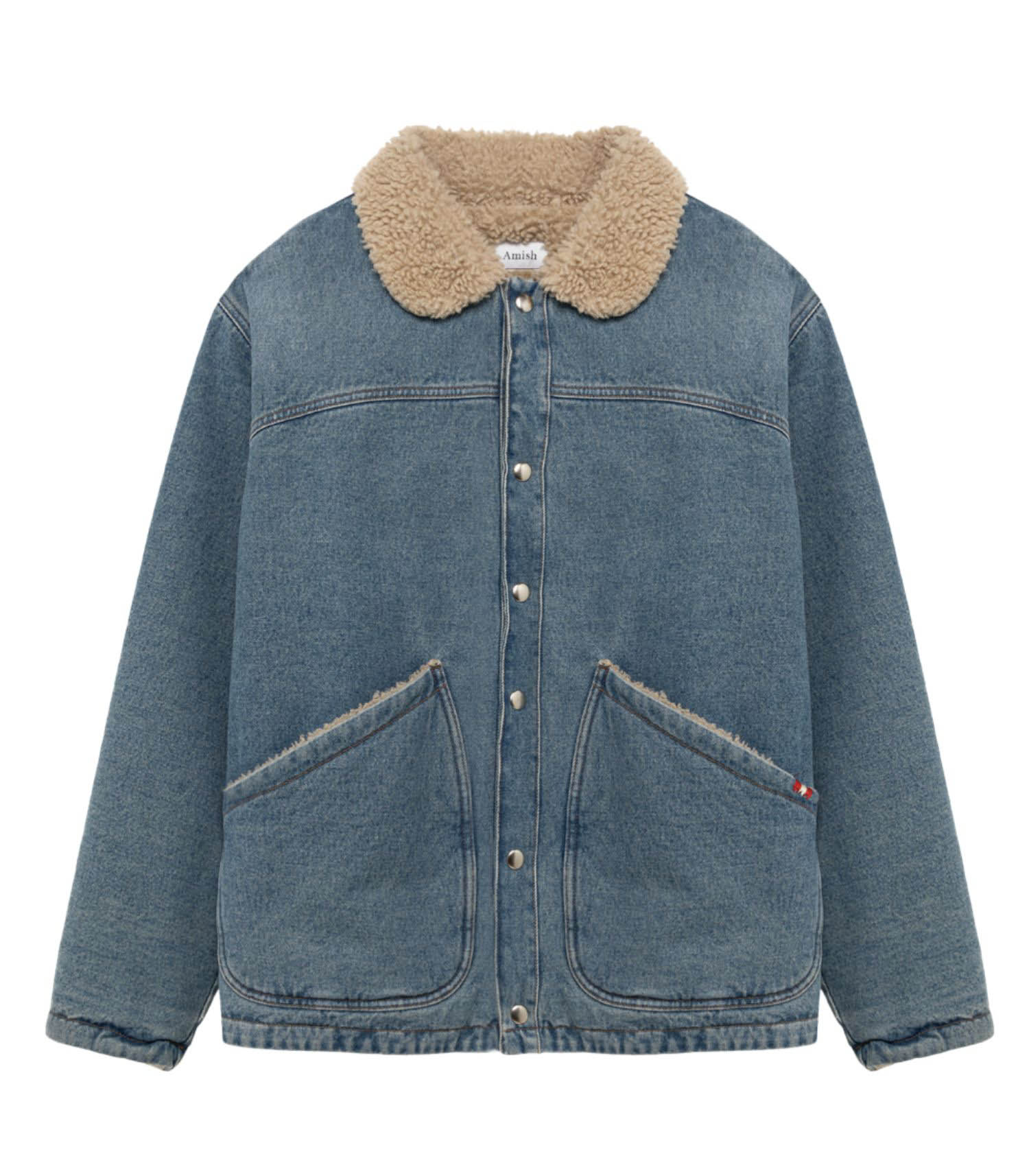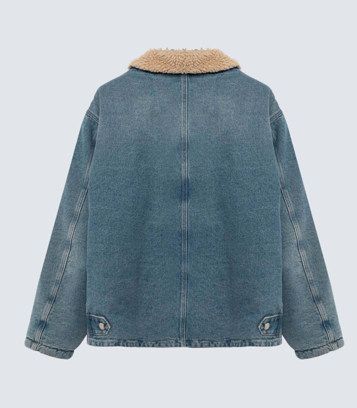 La veste Denim with Shearling puise son inspiration dans l’esthétique « Paninaro » des années 80, tout en adoptant une teinte denim lavée moderne. Elle se pare d’un col classique et se ferme par des boutons-pression, alliant praticité et style. Des poches avant complètent sa silhouette, rehaussées d’un point de broderie contrasté, signature subtile qui lui confère du caractère.