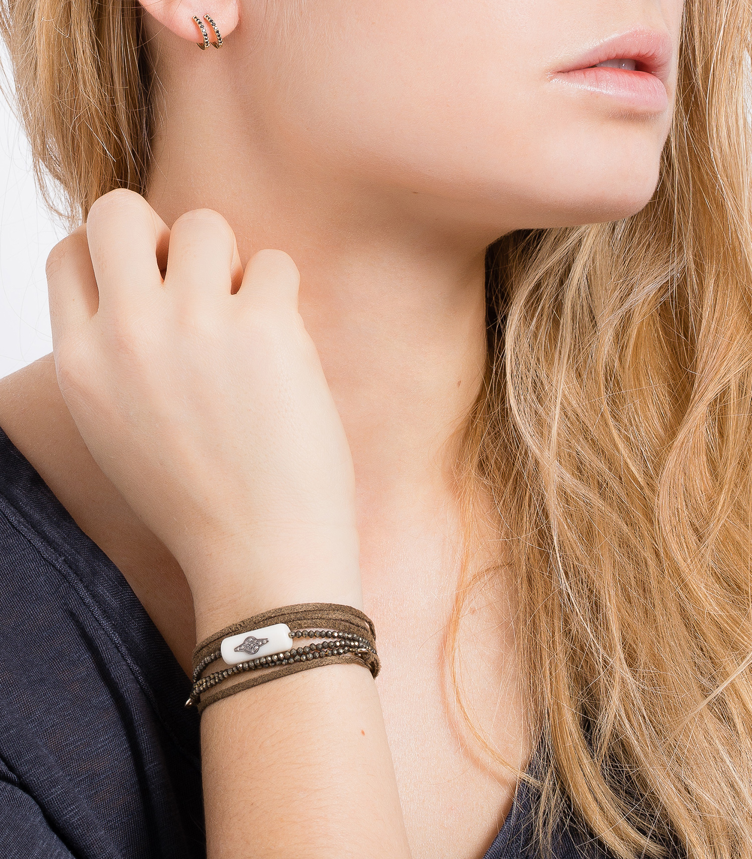 La créatrice de And... Paris se laisse porter par son imagination et propose cette boucle d'oreille double créole diamants noirs. Une création alliant belles matières et ligne graphique créative dans l'air du temps. Mettez-la en avant avec une coiffure dégagée sur un côté tel un chignon flouté esprit bohème.