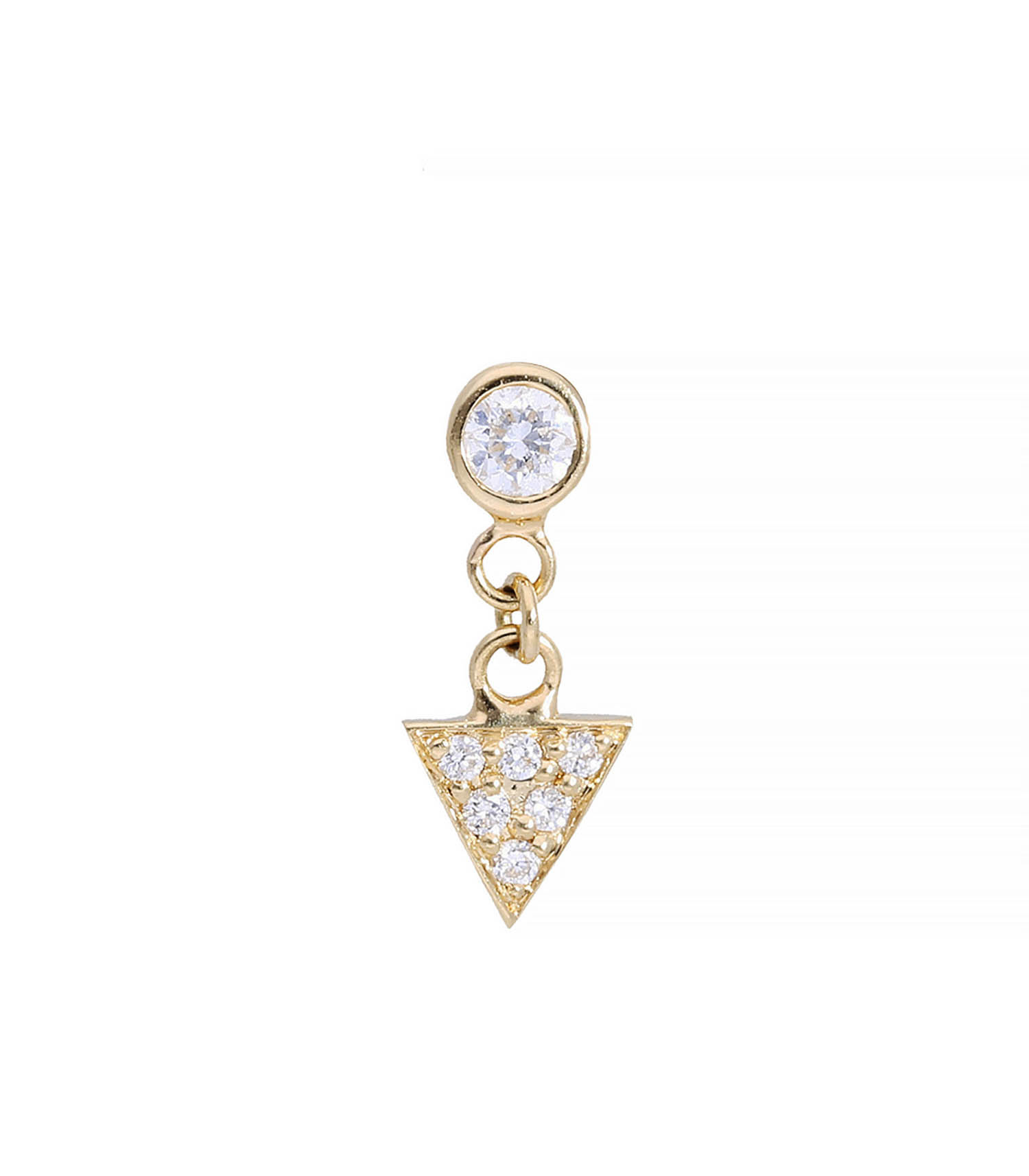 La créatrice de la marque de bijoux And... Paris joue de géométrie et de raffinement avec cette boucle d'oreille solo diamant et triangle. La forme ronde rencontre un pendant en triangle porté par des maillons, gages d'un design contemporain.