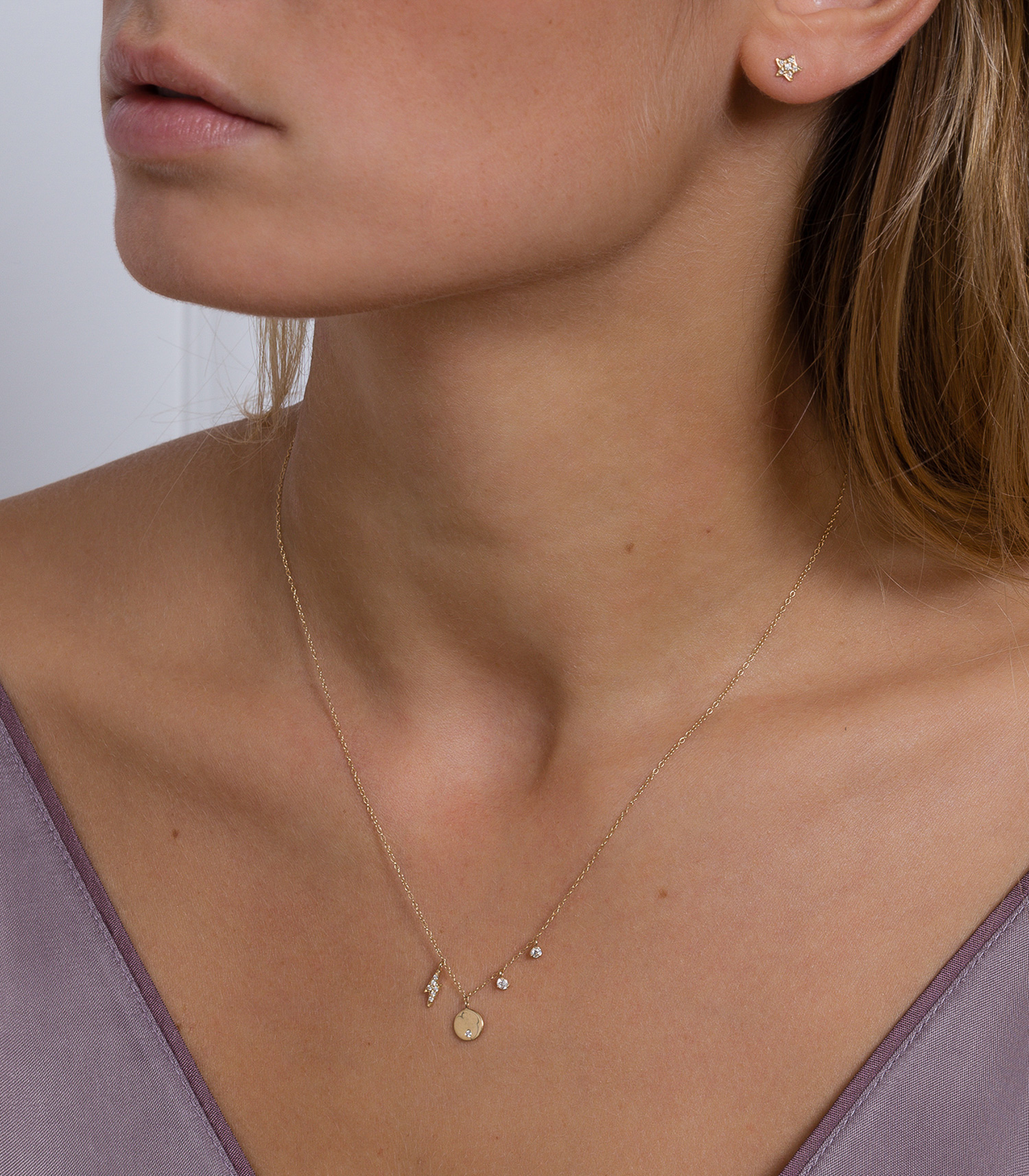 Adoptez le look globe-trotter élégant de la marque And... Paris en portant le collier Buzios éclair charms diamants avec d'autres colliers en or de différentes tailles.