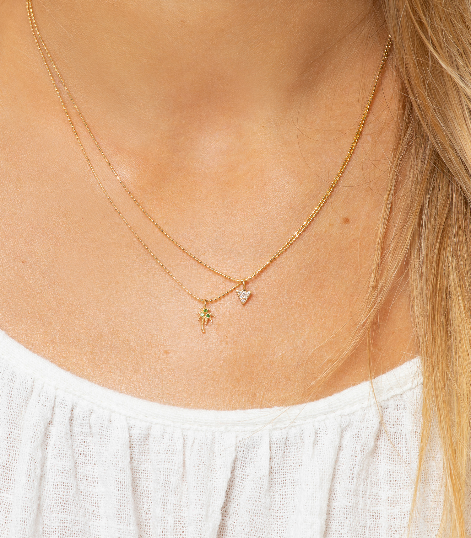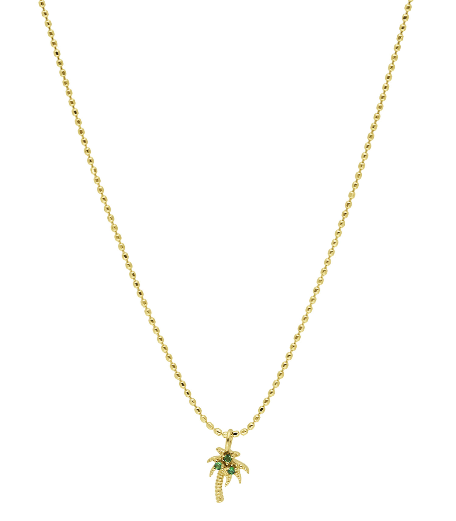 Summer vibes à l'horizon avec ce collier précieux des collections And...Paris, un collier court agrémenté d'une chaîne à petites boules facettées et d'un pendentif mobile en or jaune en forme de palmier. 3 petites pierres tsavorites vertes viennent agrémenter ce palmier pour une touche colorée.