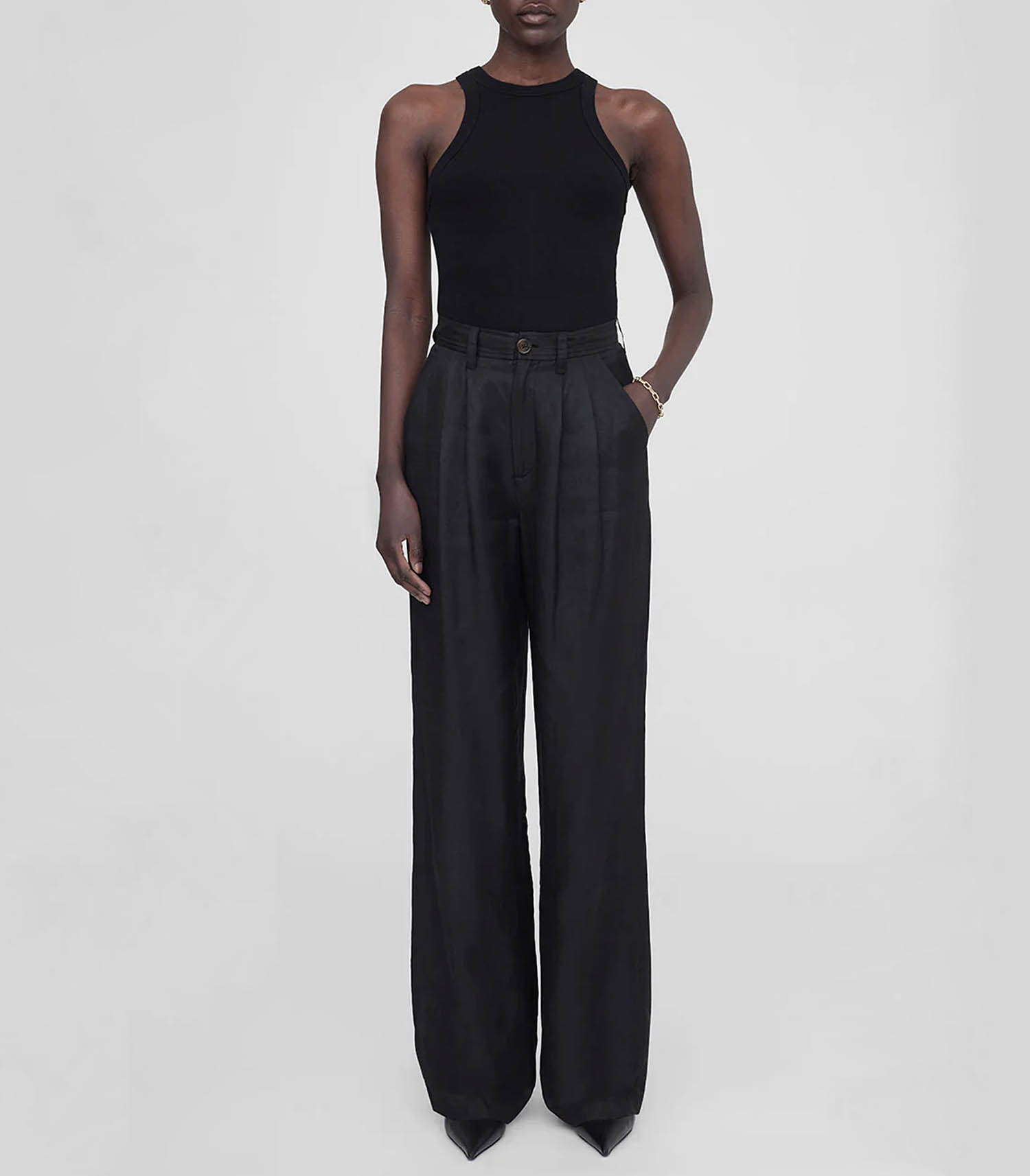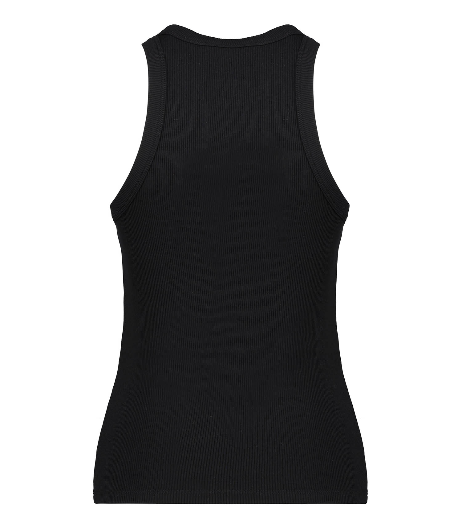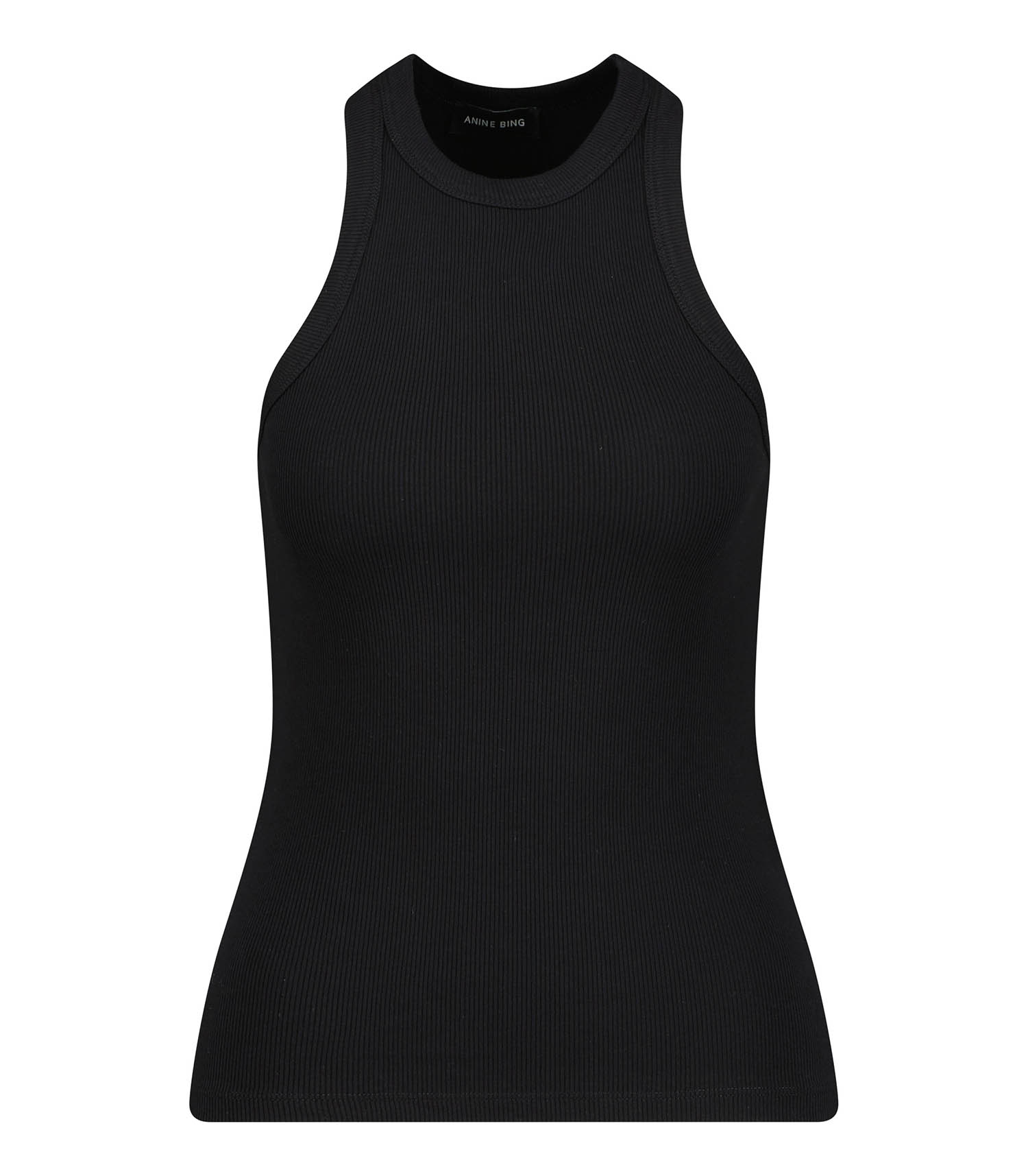 Débardeur Eva Noir de la marque Anine Bing, un top sans manches basique mais essentiel de la garde-robe féminine. On le porte seul ou sous un gilet, une chemise ou encore un blazer. Son coloris noir lui permet d'être associé à une multitude de bas.