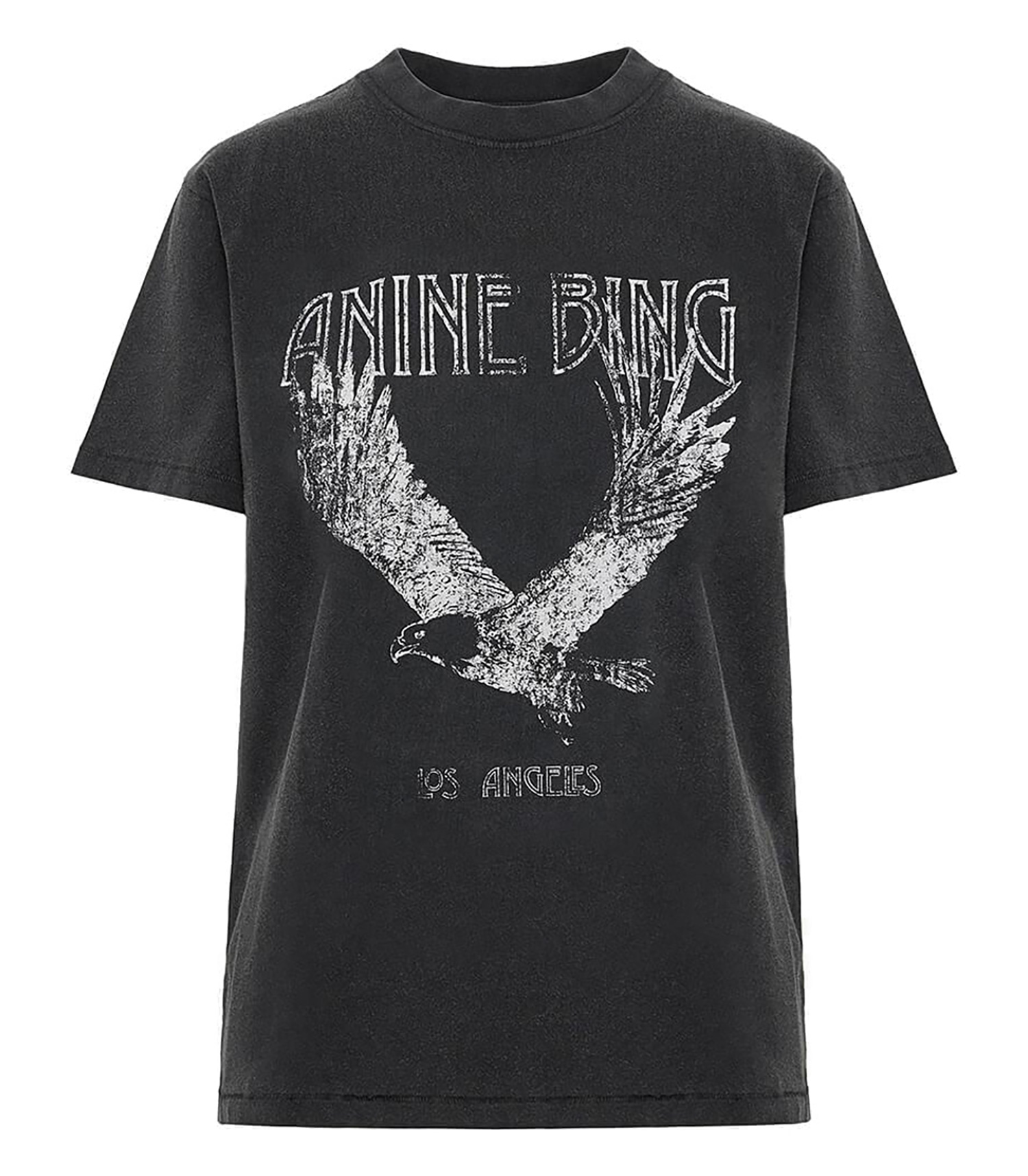Tee-shirt Anine Bing, modèle Lili à imprimé Eagle inspiré des tee-shirts vintage des groupes de rock. Un tee-shirt noir délavé à coupe loose, agréable à porter dans son 100% coton naturel.