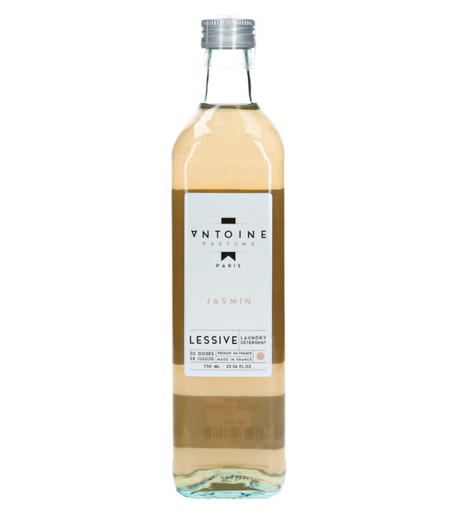 Lessive Jasmin 750 ml signée Antoine Parfums, une lessive à la douce senteur de Jasmin associée au Muguet frais. Le tout est réchauffé par de la vanille et du patchouli en fond.