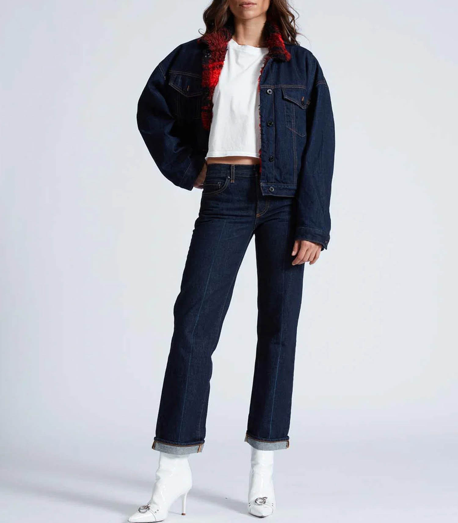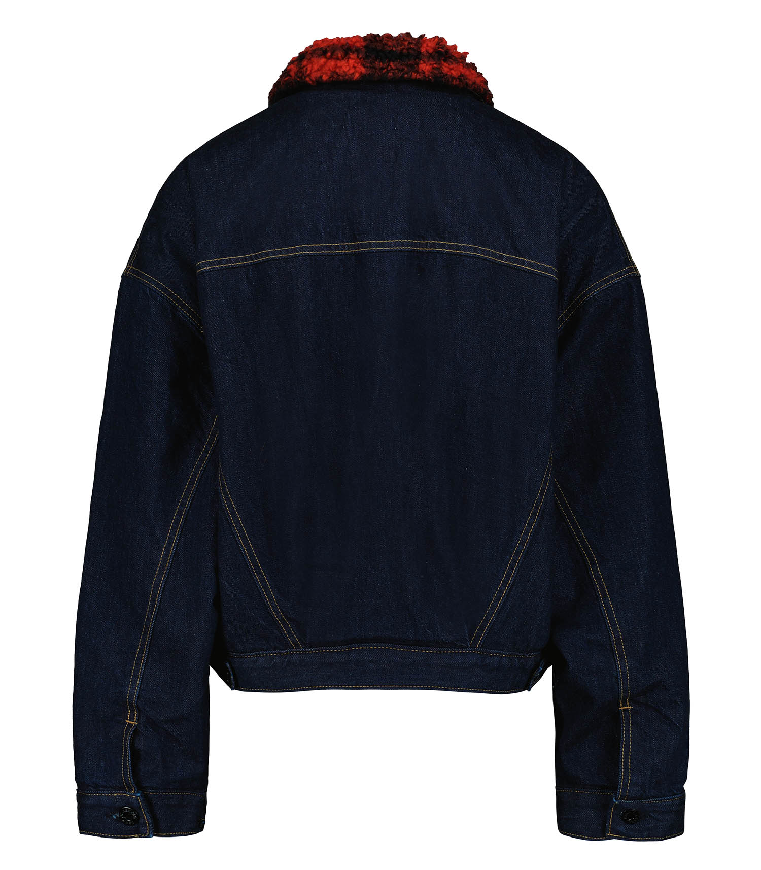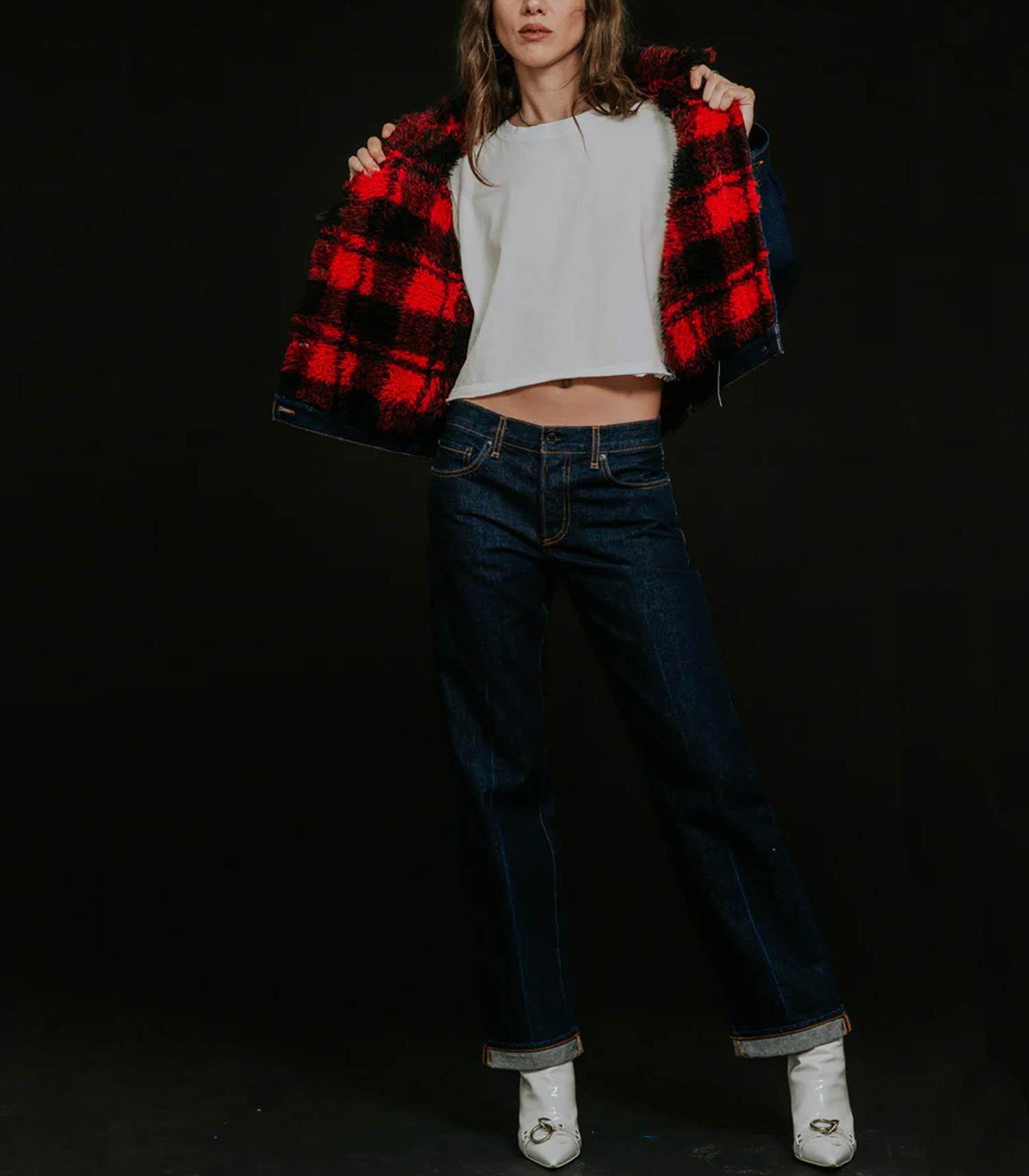 Veste en Denim Nova Lined Indigo Plaid signée ASKK NY. Cette veste en jean présente une coupe courte et oversized avec des emmanchures basses pour un effet légèrement bouffant. La doublure en fourrure à carreaux esprit tartan ajoute une note preppy et rétro.
