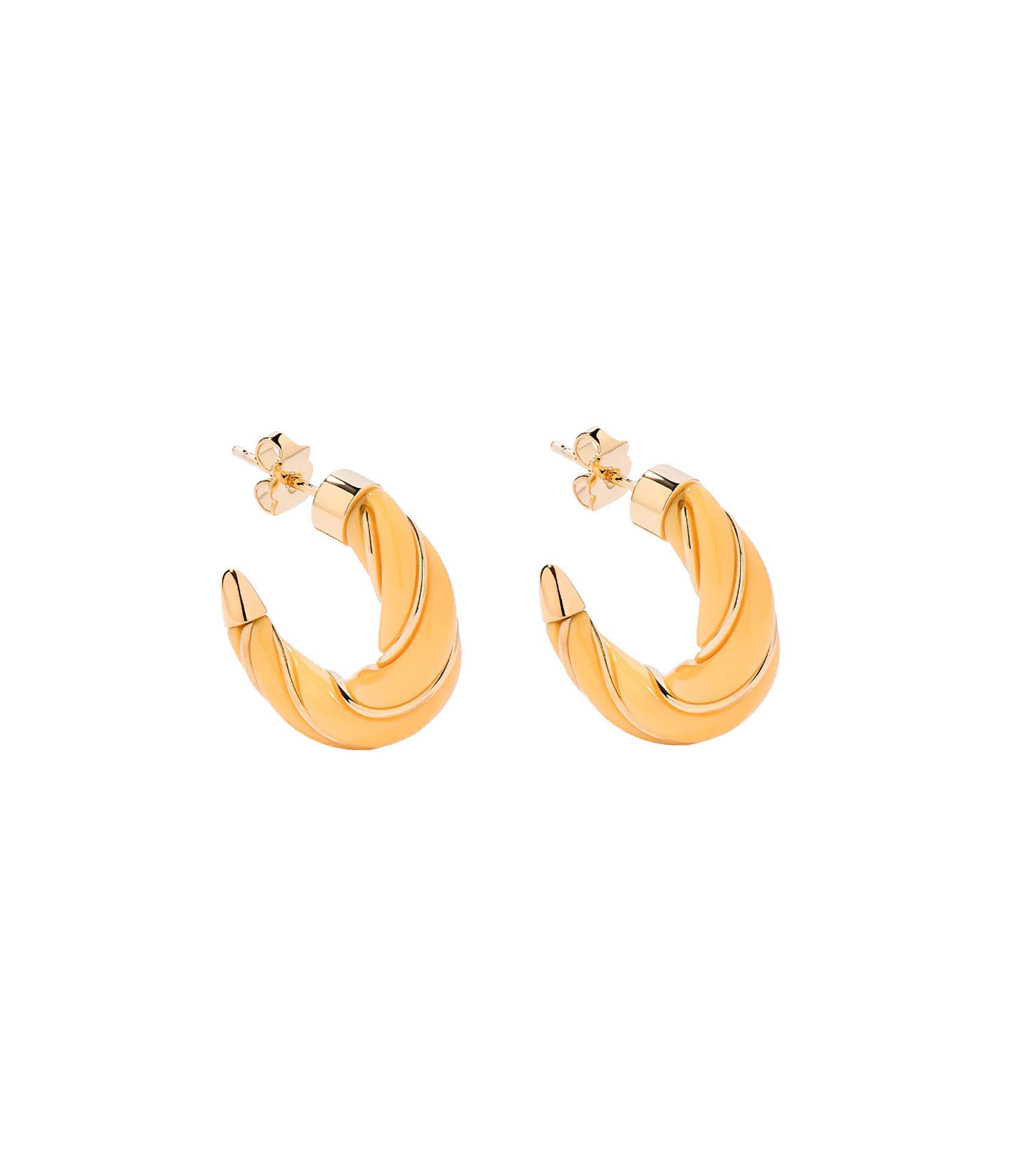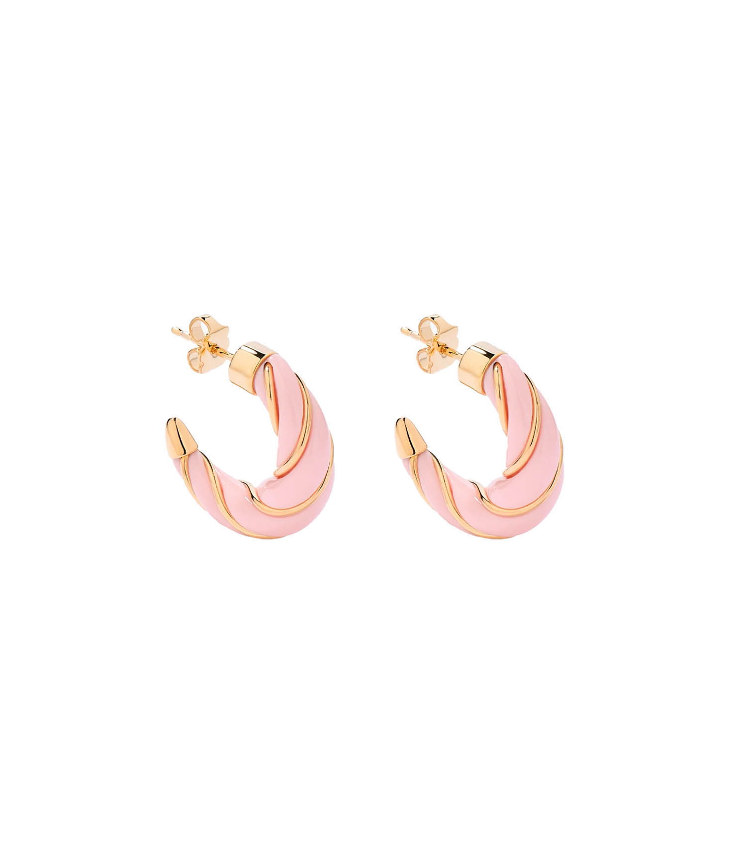 Boucles d'oreilles Diana PM de la marque Aurélie Bidermann. Ces mini créoles jouent sur une élégance subtile et moderne, grâce à leur base en résine colorée délicatement striée de doré. Leur format compact les rend parfaites pour ajouter une touche raffinée à n’importe quel ensemble.