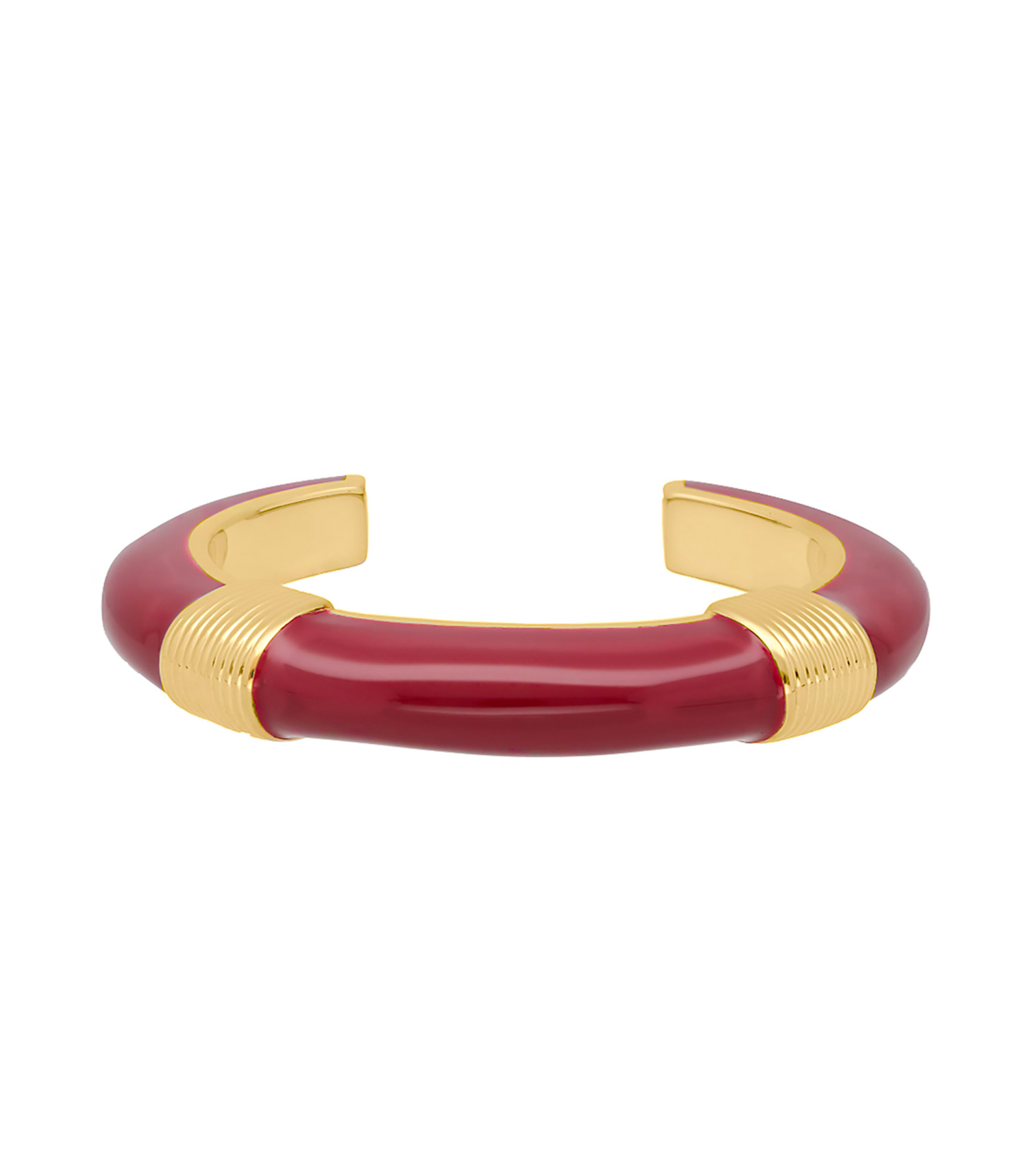 On aime l'allure graphique du bracelet Katt Bordeaux Aurélie Bidermann, un incontournable de la créatrice parisienne dans un nouveau coloris aussi chic de jour comme de nuit, reconnaissable instantanément avec son double détail strié en plaqué or jaune 750/1000.