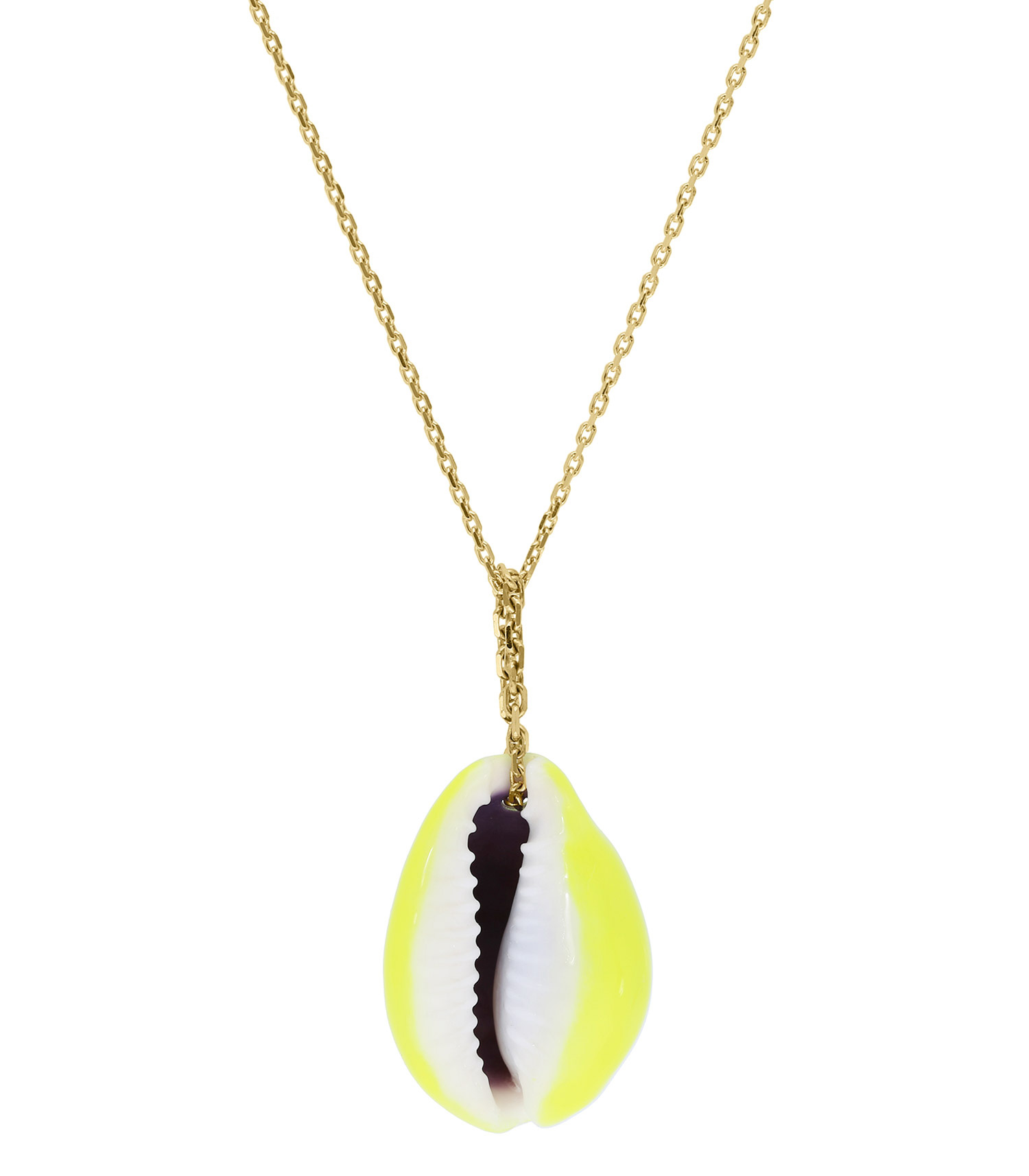 Collier Coquillage Merco signé Aurélie Bidermann, doté d'une chaîne en maille forçat en or 750/1000 agrémentée d'un pendentif en coquillage véritable laqué en jaune fluo. Coloré, il donnera un look exotique à vos compositions de colliers. Chaque coquillage est unique, ce qui peut entrainer des variations de forme et de couleur par rapport à l'image.