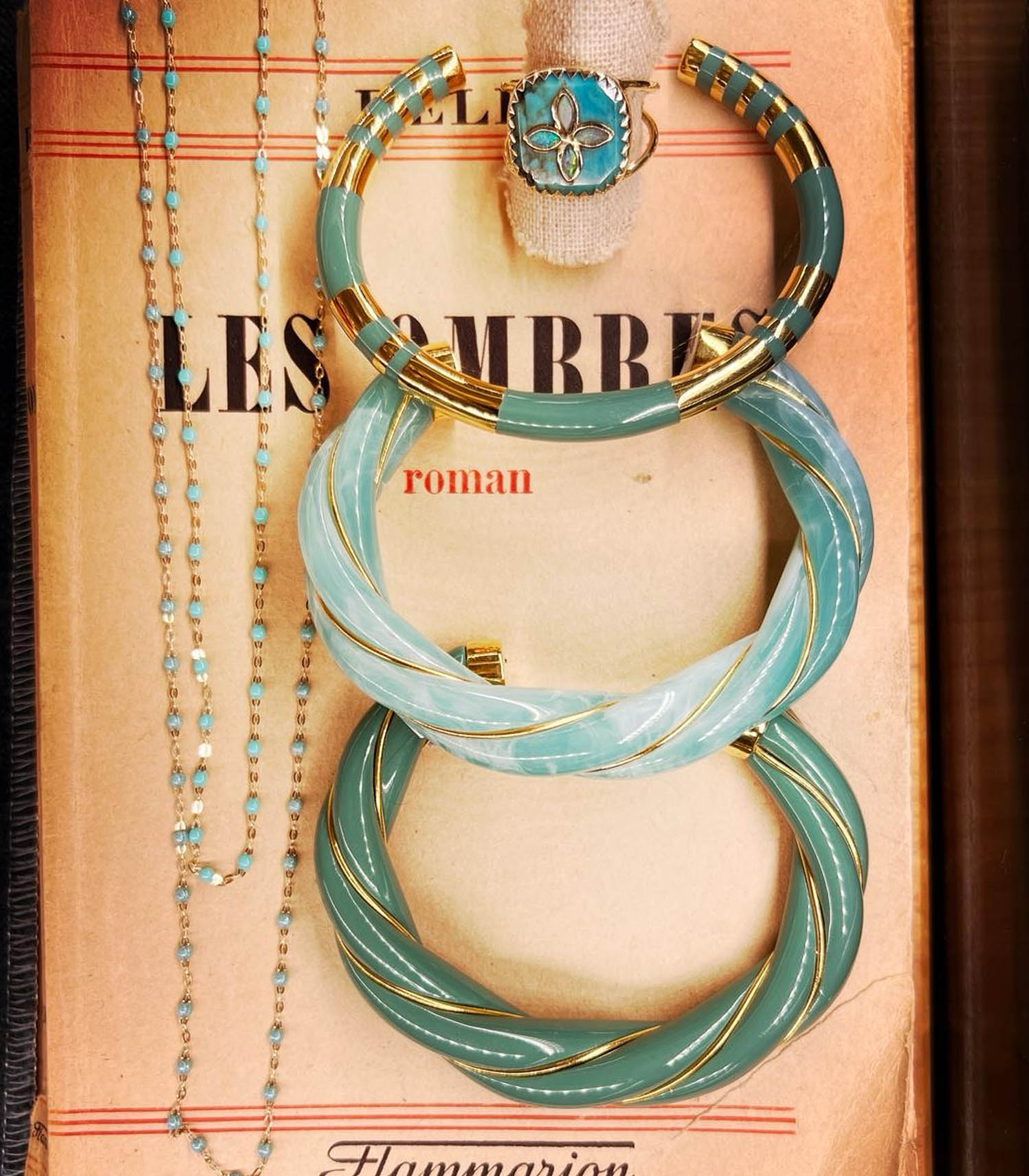 Jonc Diana vert tilleul de la marque Aurélie Bidermann. Ce jonc rigide de la collection Diana est confectionné en résine vert tilleul, subtilement torsadée et rehaussée d’un délicat fil en or jaune, évoquant l’esprit des torques hippies des années?60, en hommage à l’icône Diana Ross.