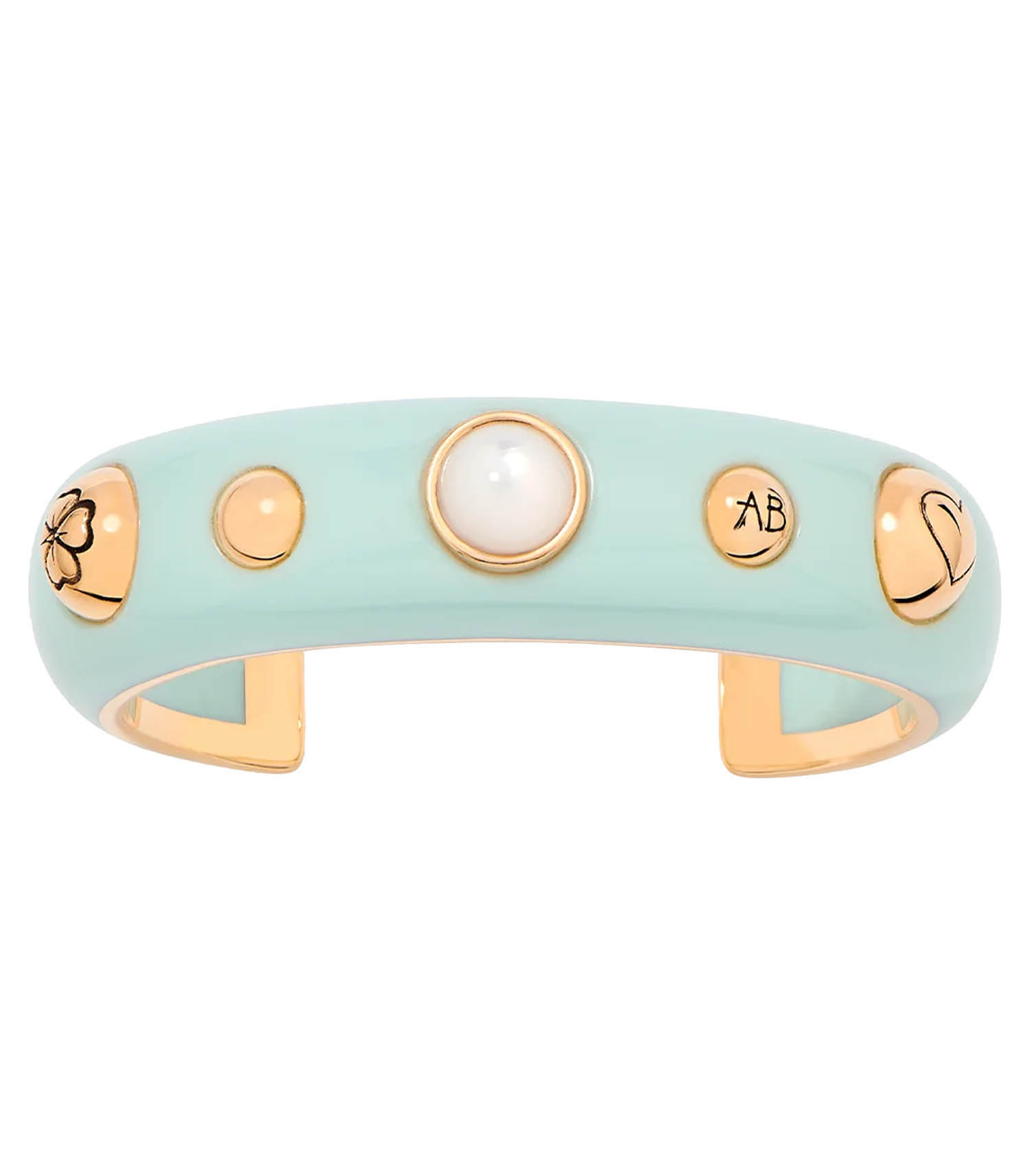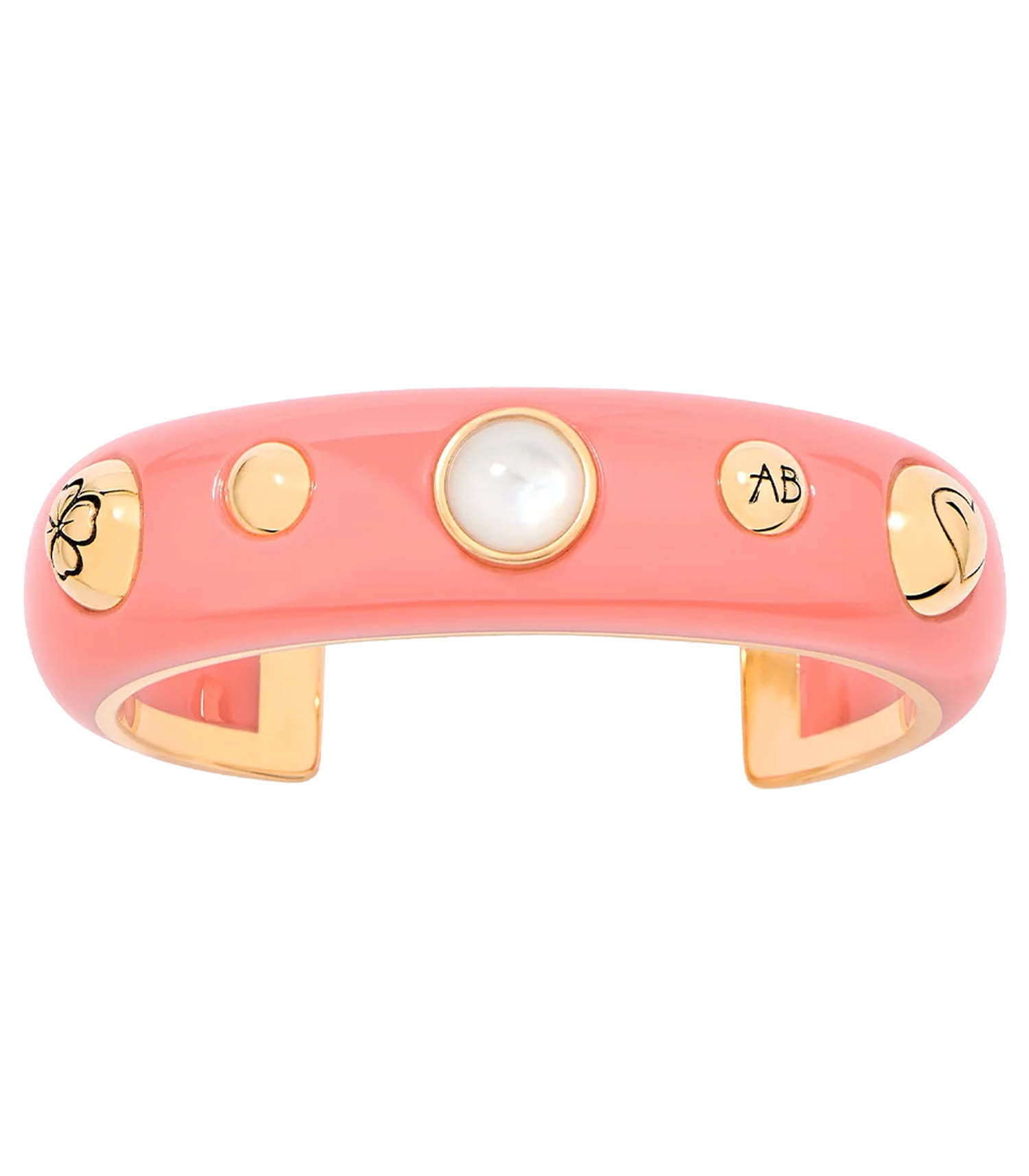 Parmi les grandes figures de Palm Beach, Aurélie Bidermann a choisi Dysie. Un personnage imaginaire qui aurait marqué aussi bien la fameuse C.Z ou encore Alice Topping, célèbres socialites et meilleures organisatrices des mondanités des lieux. Ce jonc aux teintes pastel agrémenté de cabochons en métal doré aux dessins gravés.