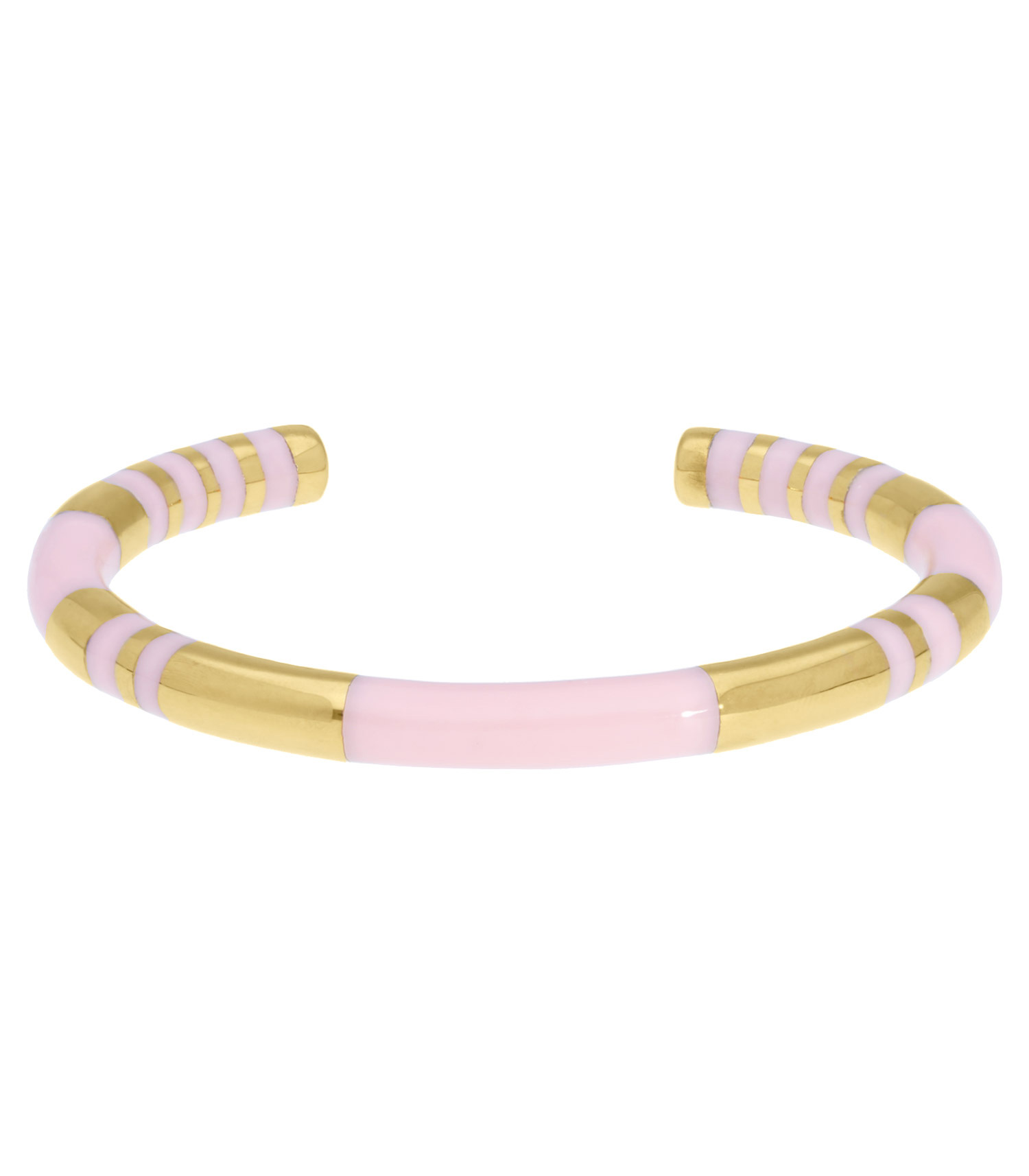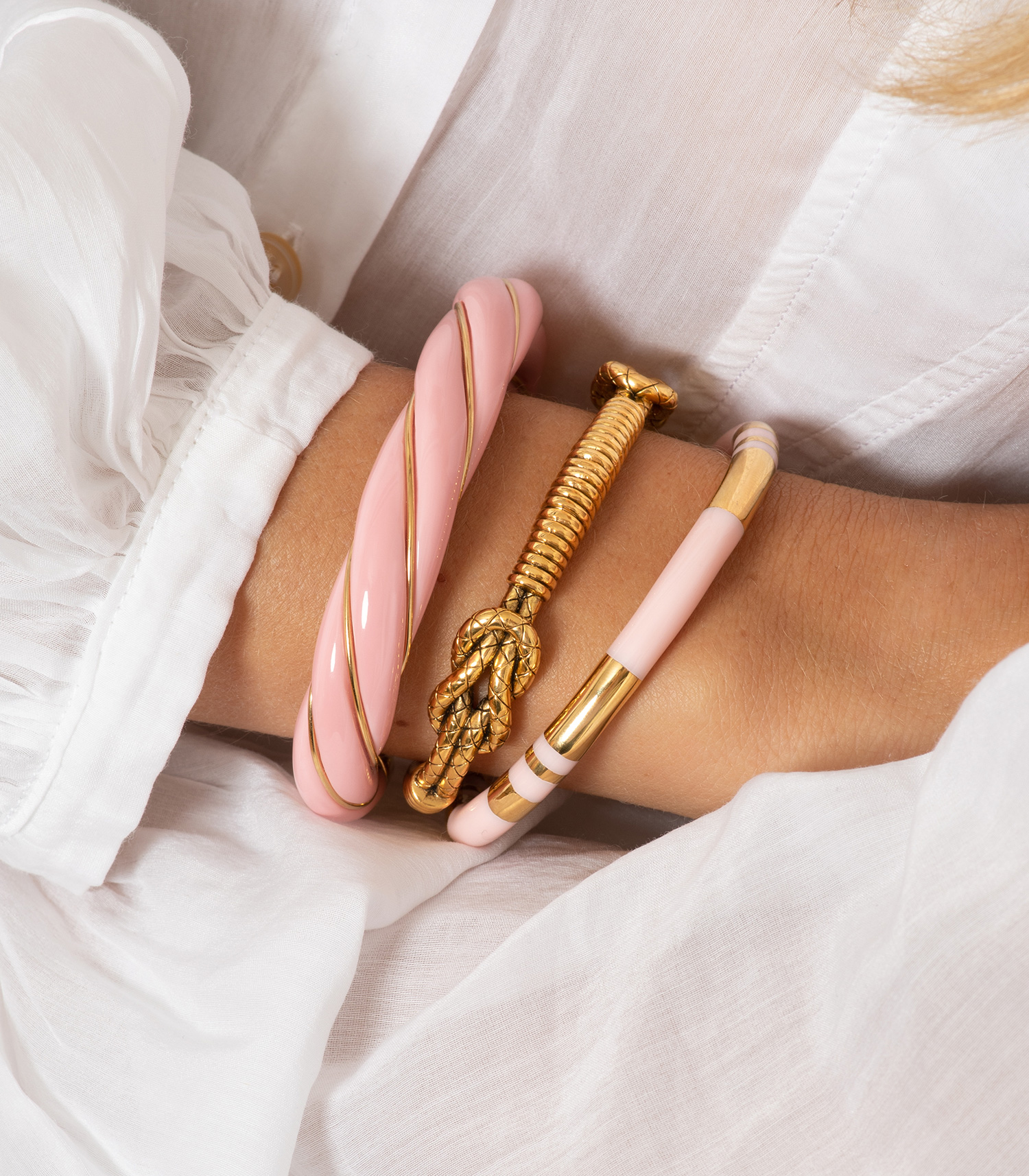 Jonc Actua Positano Baby Pink Aurélie Bidermann en résine rose et empiècements en or 750/1000. La collection Positano évoque les couleurs et la lumière de la côte amalfitaine pour des bijoux qui sentent bon l'été.