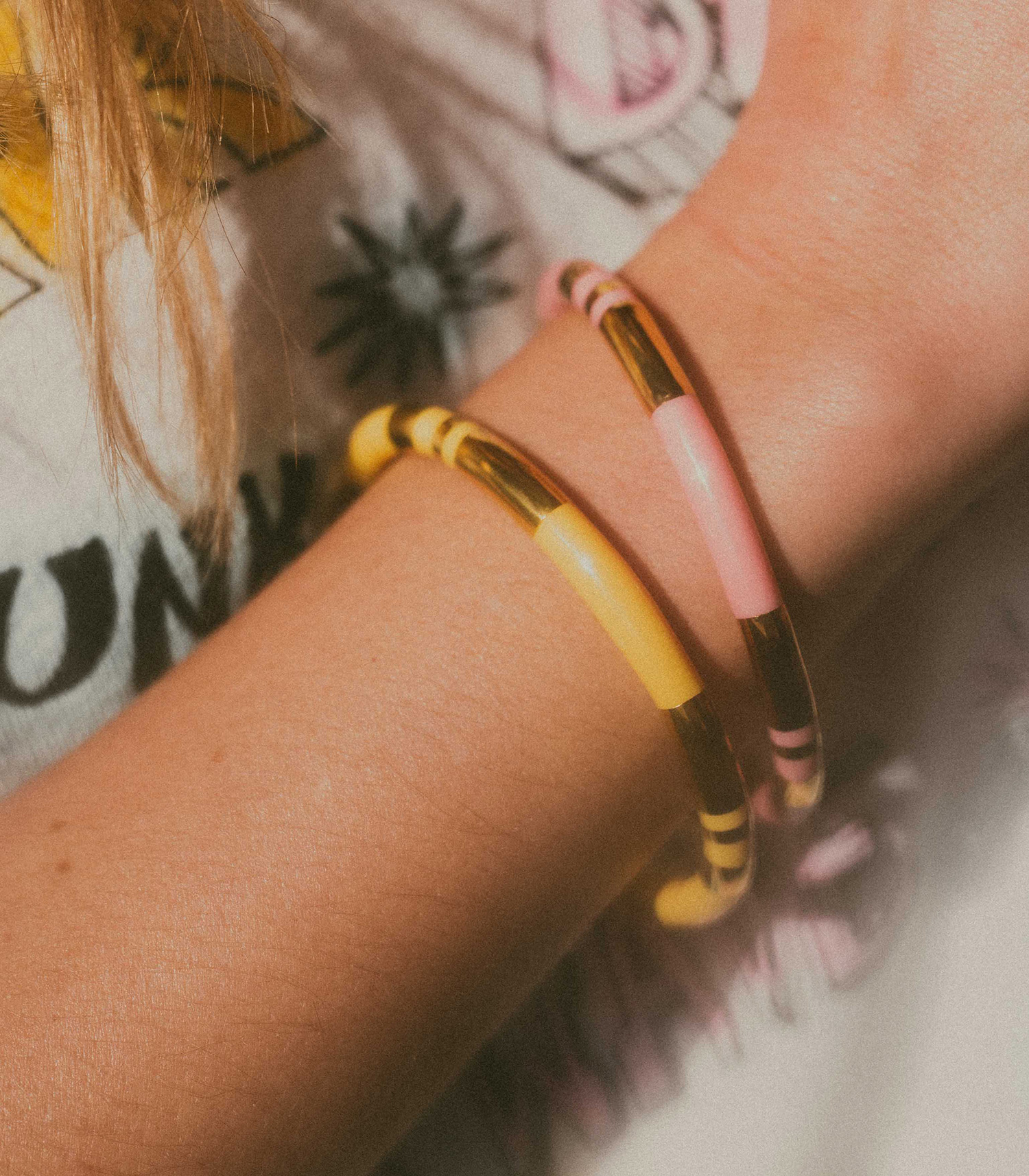 Jonc Positano Rose Aurélie Bidermann en résine rose et empiècements en or 750/1000. La collection Positano évoque les couleurs et la lumière de la côte amalfitaine pour des bijoux qui sentent bon l'été.