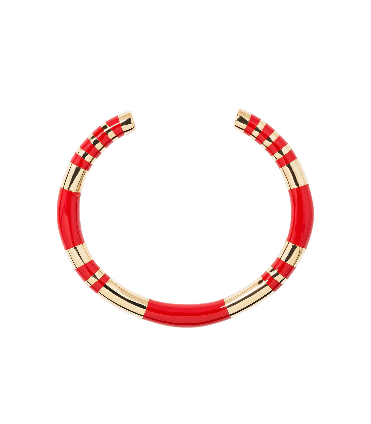 Jonc Positano Rouge Corail de la marque Aurélie Bidermann. Jonc Positano à rayures vermillon en résine et doré à l'or jaune 750/1000.