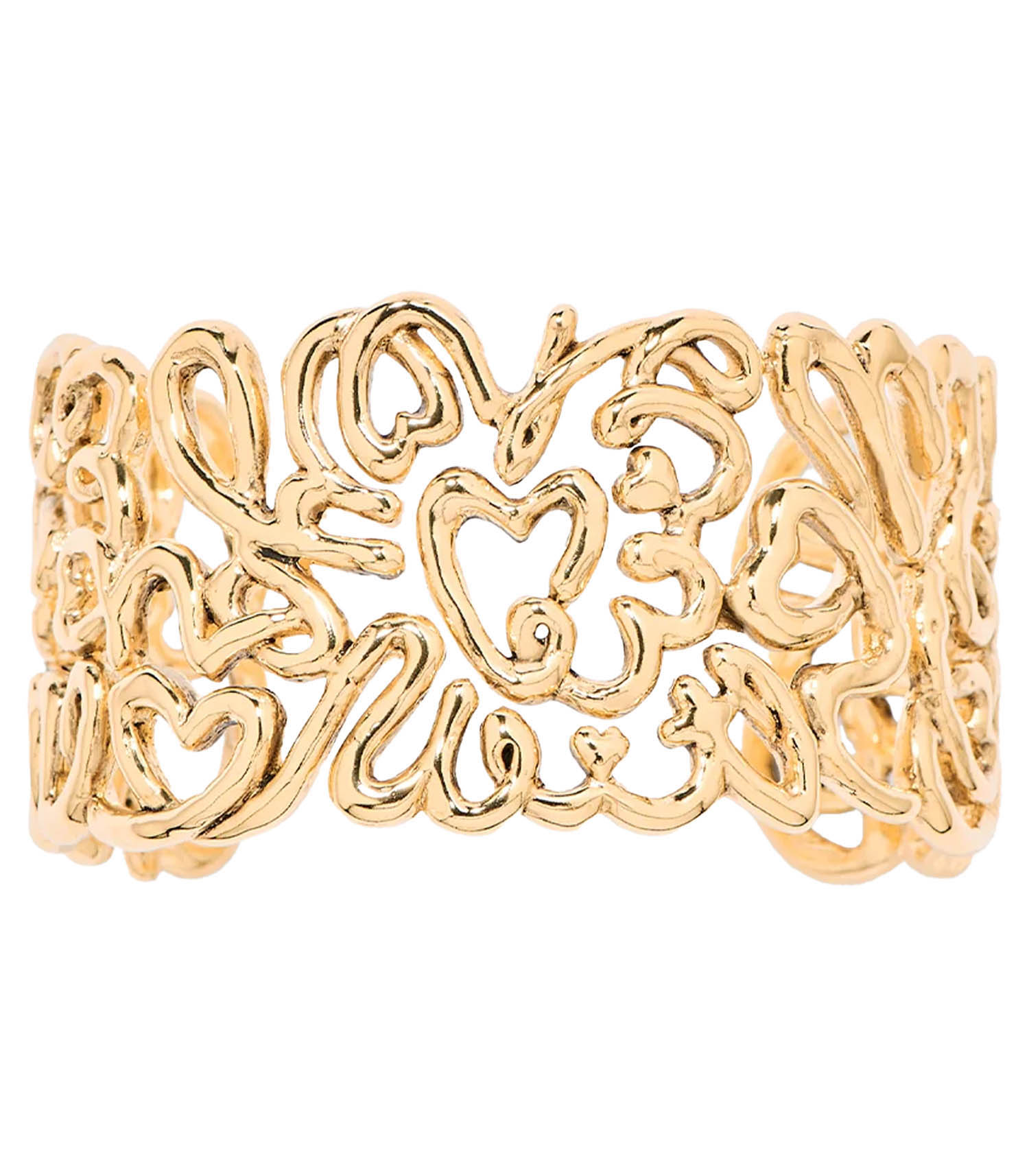 Manchette Sweeny signée Aurélie Bidermann. Avec sa teinte dorée Palm Beach, c'est d'abord la promesse d'un bonheur absolu. Un credo que vient cultiver la collection Sweeny, avec son motif cœur jouant avec les irrégularités subtiles du métal doré.