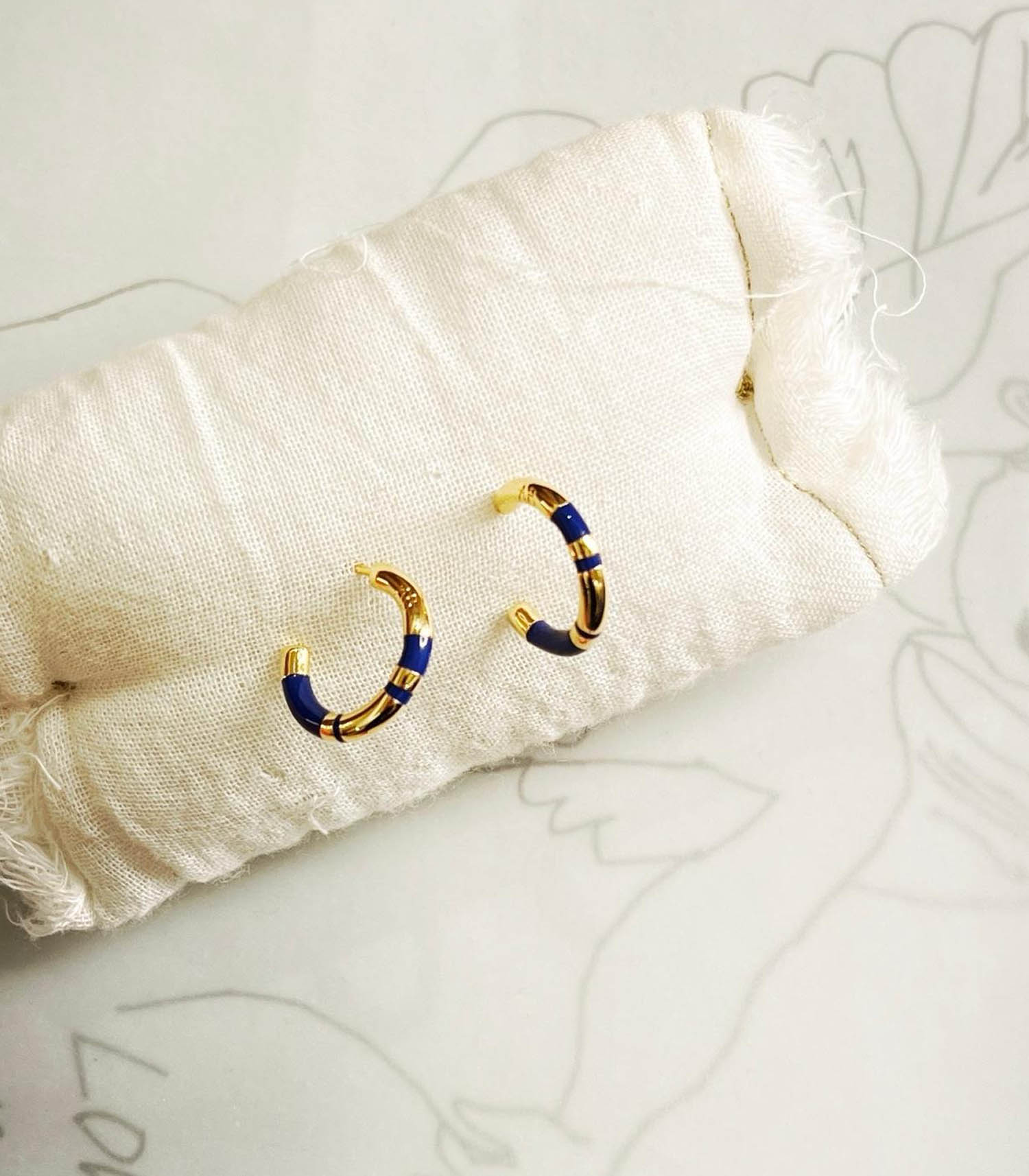 Mini créoles Positano à rayures bleu lapis en résine et dorées à l'or jaune 750/1000.
