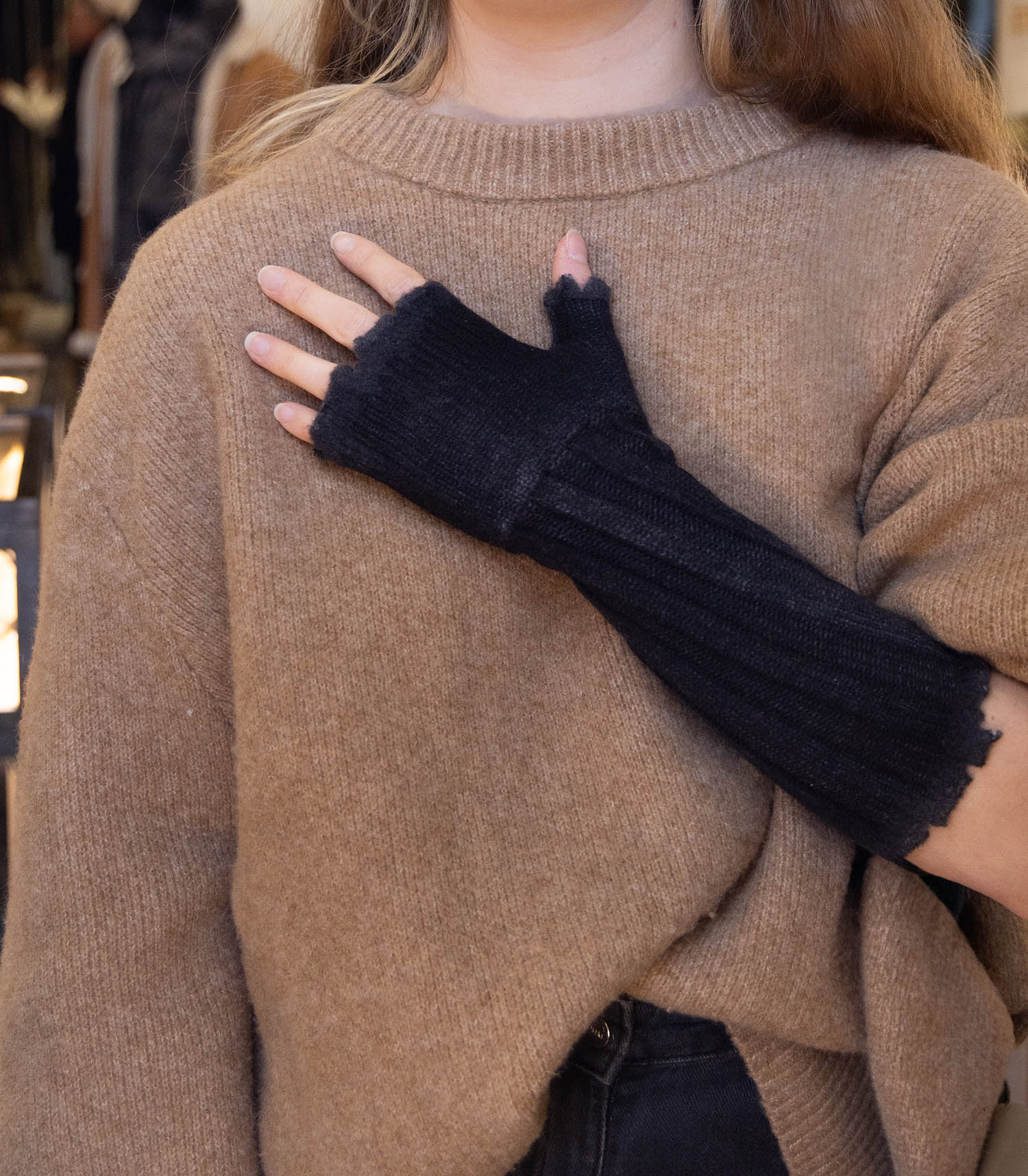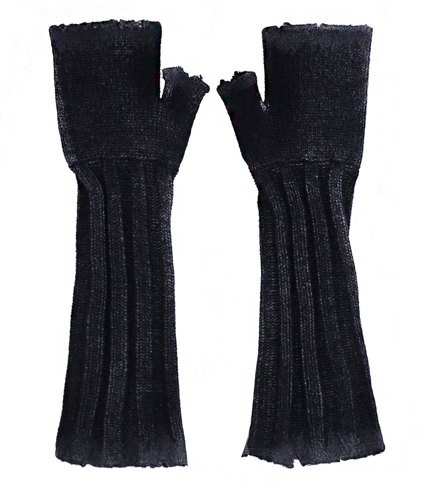 Mitaines longues Nero de la marque Avant Toi, une paire de gants en maille à effet destroy. Détail côtelé aux poignets.