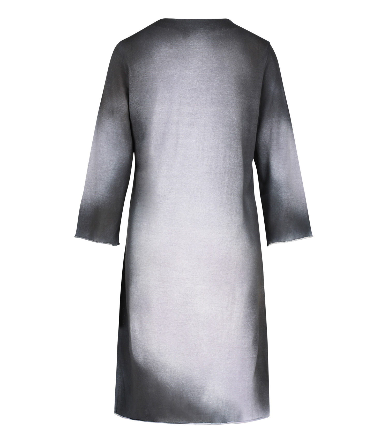 Robe Abito de chez Avant Toi, coupe droite, col rond, manches 3/4 avec emmanchure classique et bords francs. Jeux de dégradé dans la teinte avec un gris perles sur le centre et un gris plus foncé sur les côtés.