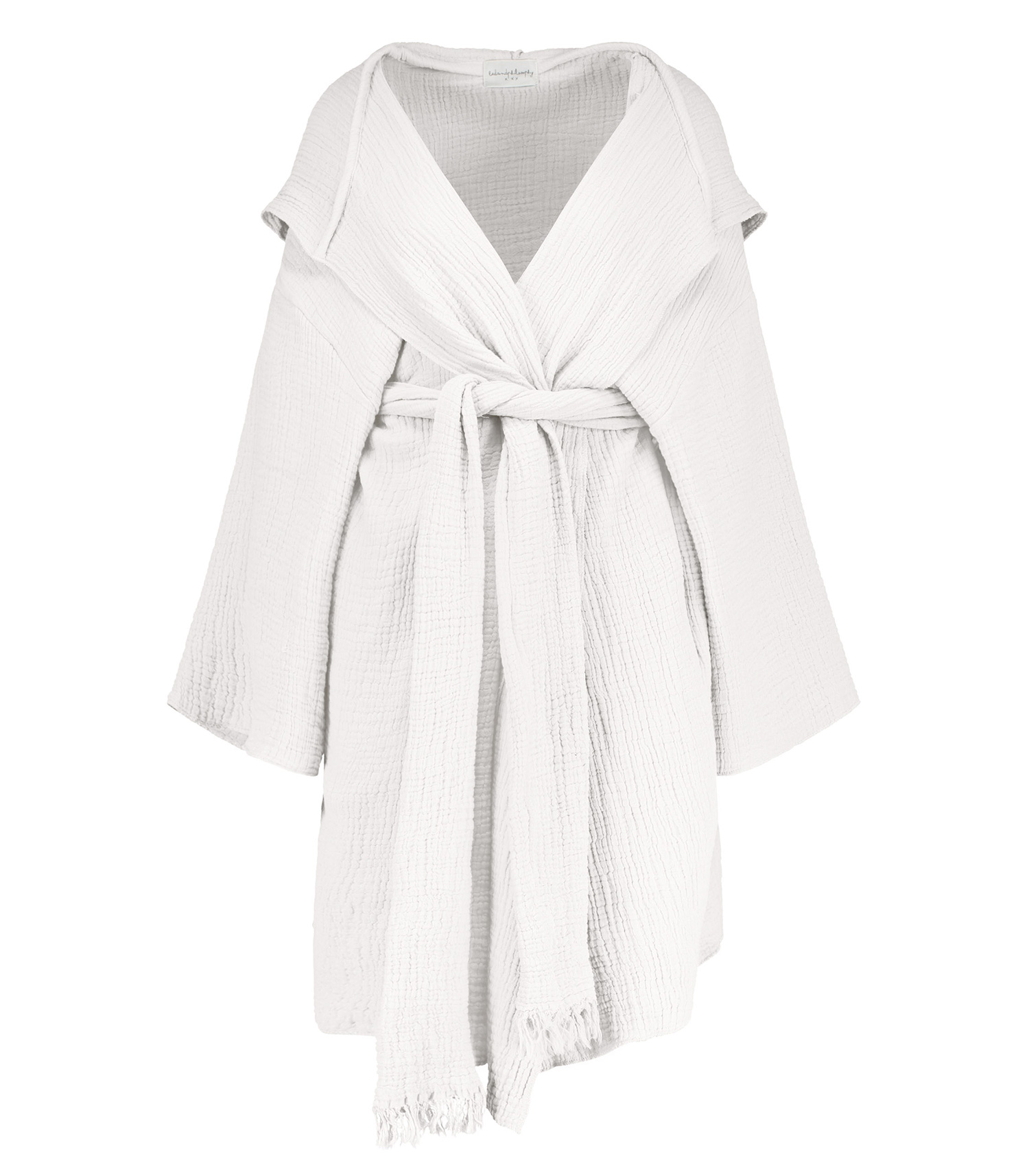 Kimono à capuche Crawl Bed & Philosophy en gaze de coton. Ce Kimono aborde un style authentique et se veut volontairement éffilé sur les bords.
