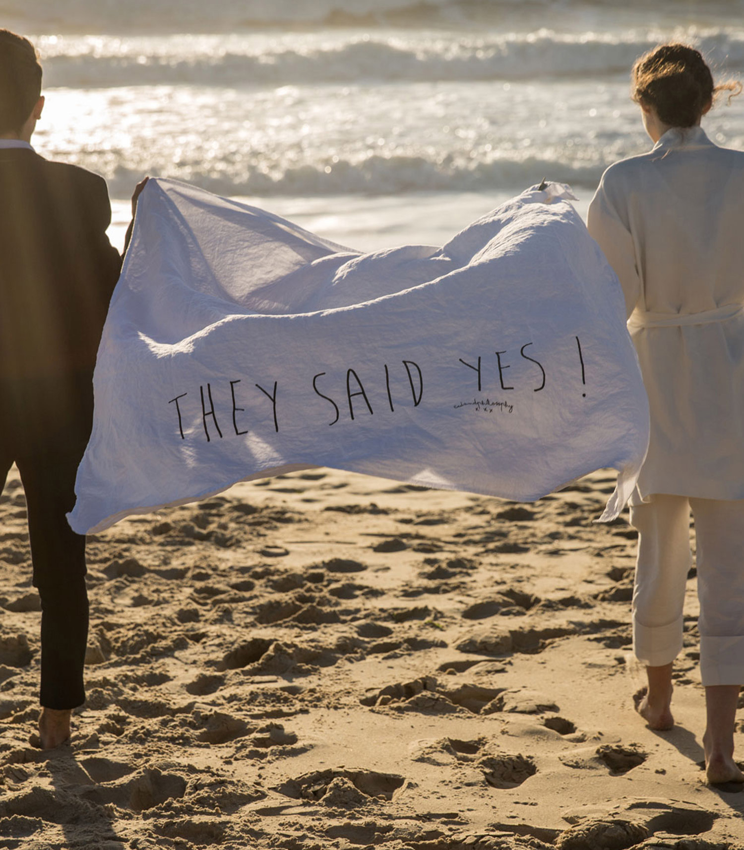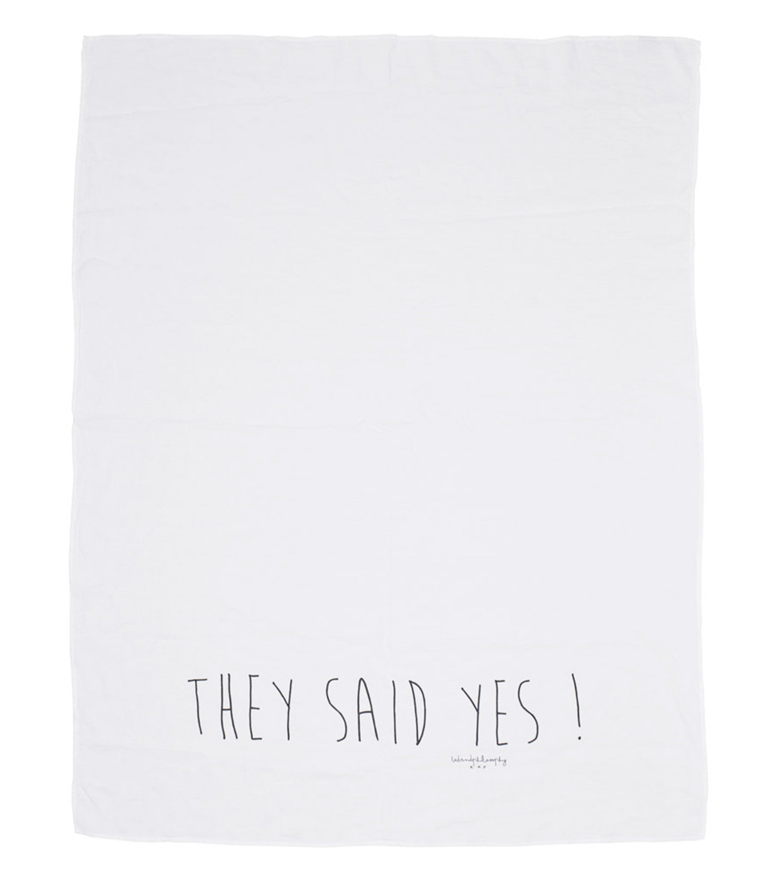 Plaid de plage Lulu Mariage signé Bed and Philosophy, un cadeau parfait pour de jeunes mariés. Entièrement en lin blanc, il affiche le message "They said yes !".
