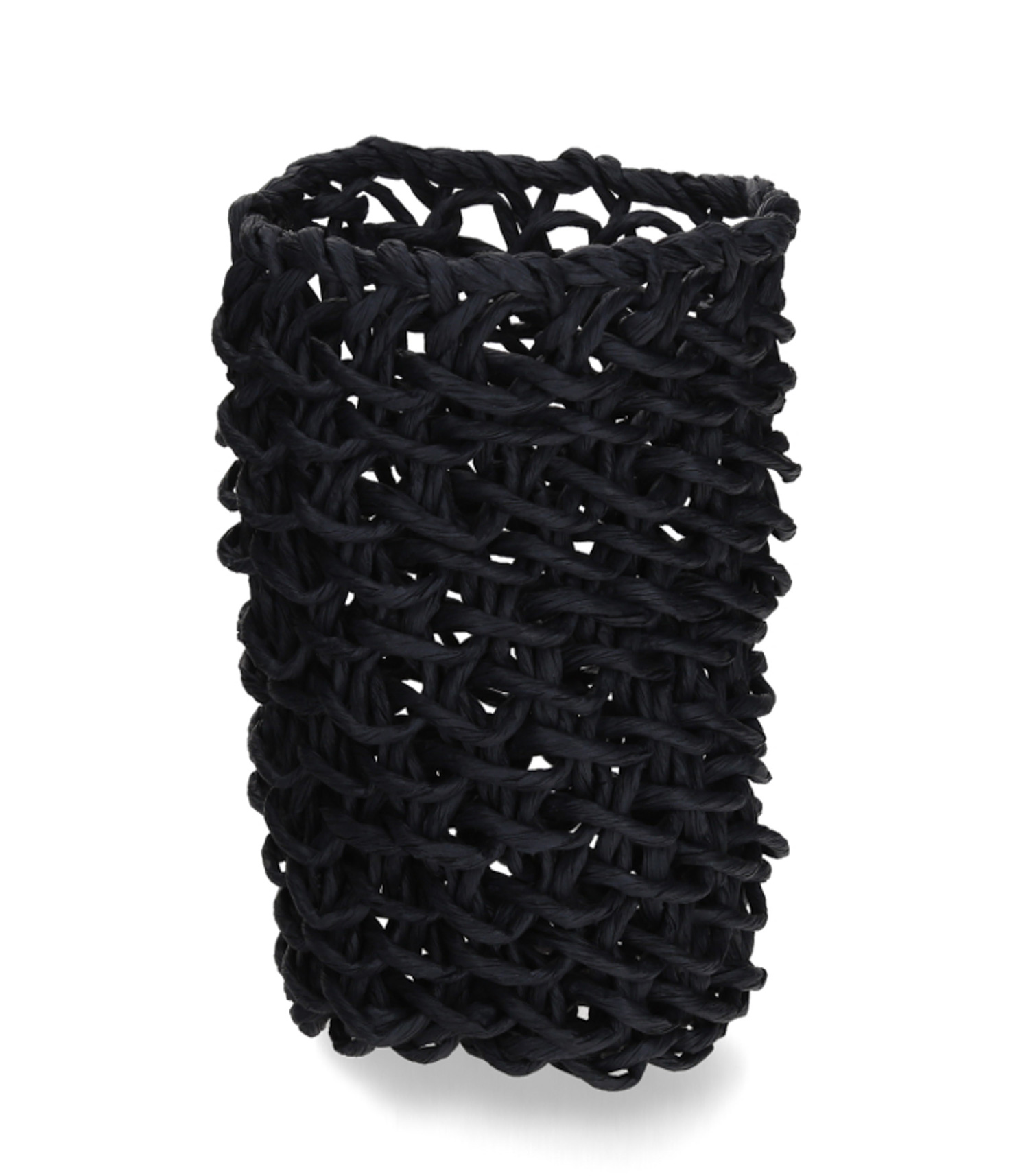 Panier Tour de Pise de la marque Best Before. Fabriqué à la main en macramé de ficelle de papier recyclé coloris Noir et respectueux de l'environnement, ce modèle trouvera sa place dans un bureau ou une cuisine pour ranger divers ustensiles ou une bouteille.