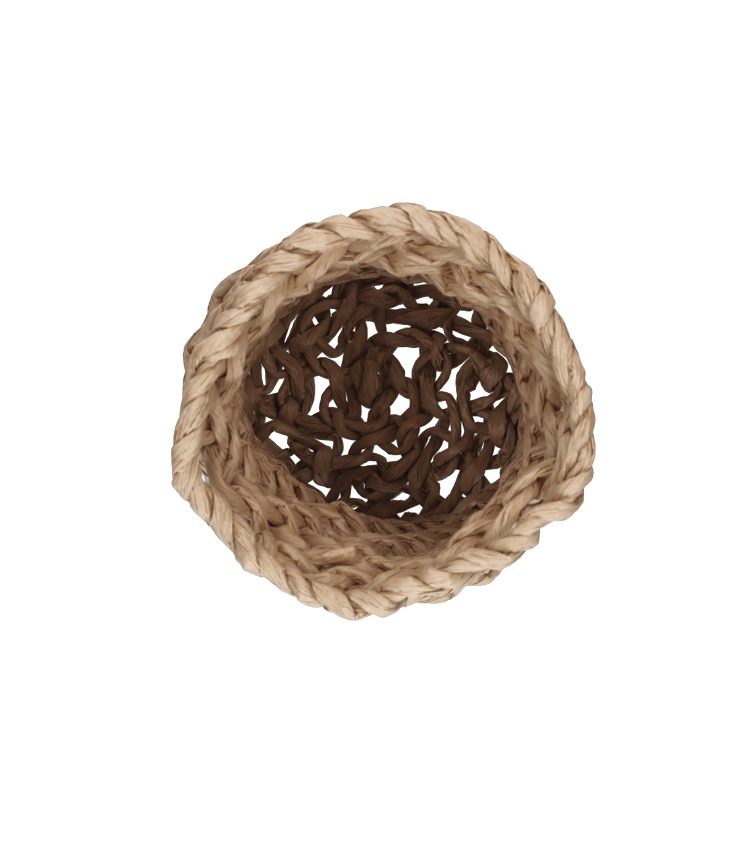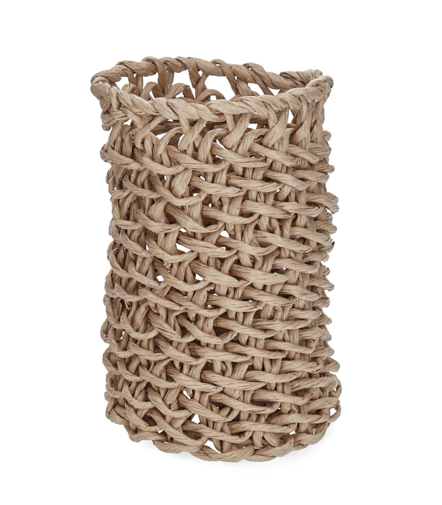Petit panier Tour de Pise de la marque Best Before. Fabriqué à la main en macramé de ficelle de papier recyclé coloris Naturel et respectueux de l'environnement, ce modèle trouvera sa place dans un bureau ou une cuisine pour ranger divers ustensiles.