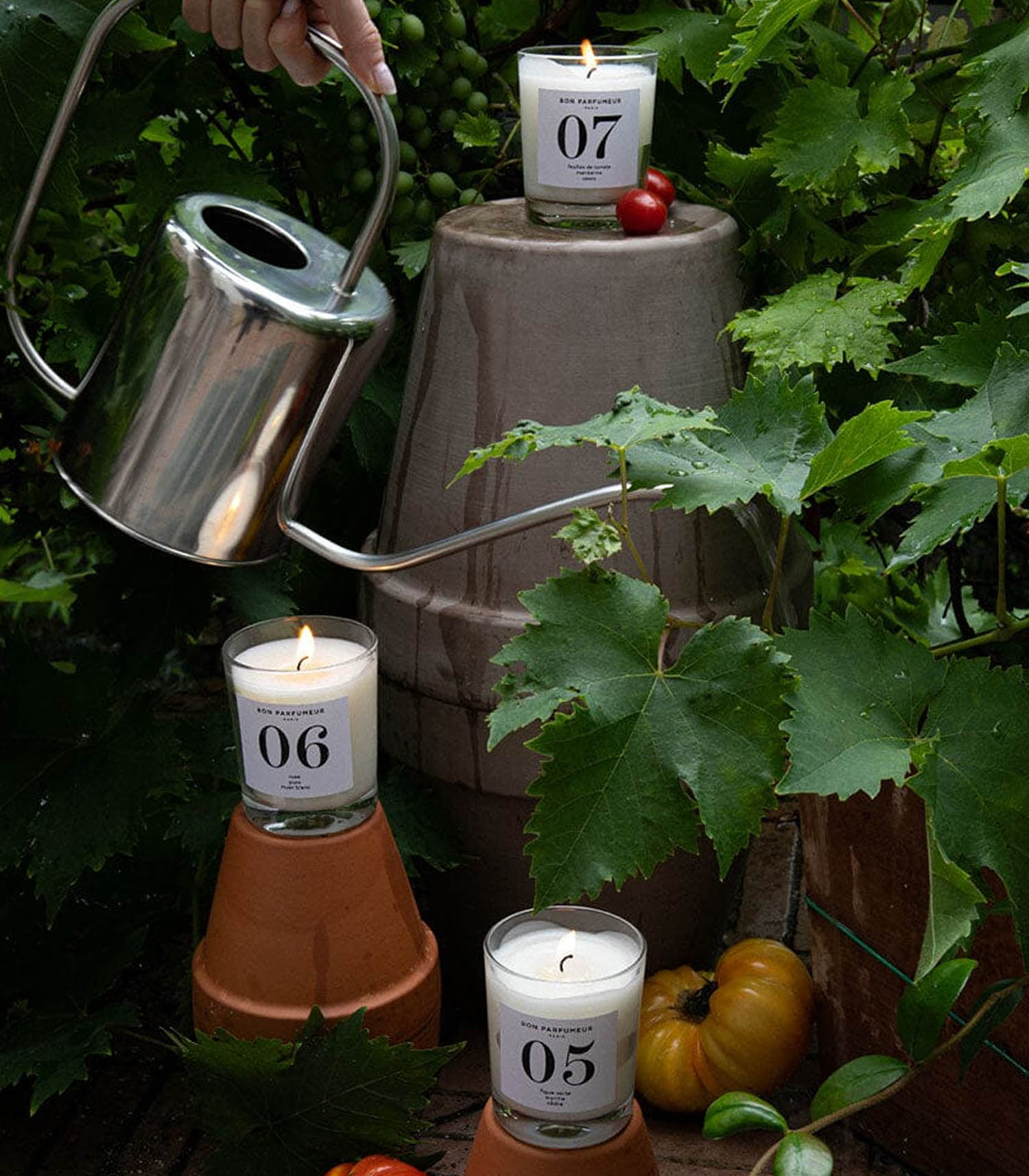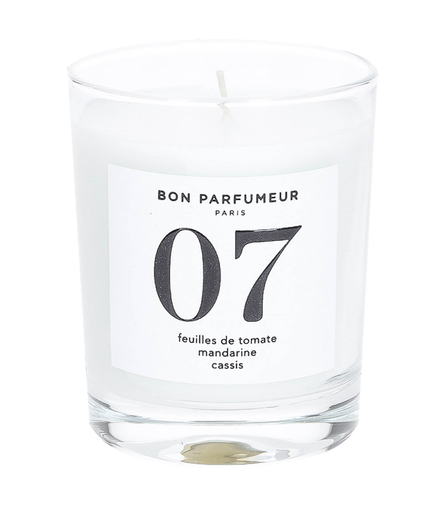 Bougie parfumée 07 Feuilles de Tomate, Mandarine et Cassis de la marque Bon Parfumeur. Son odeur évoque une matinée à la campagne, au coeur d'une nature luxuriante. Elle dévoile des notes herbacées rappellant la feuille de tomate frottée sur les doigts, de la menthe et de l'estragon qui renforce son arôme végétal. La Mandarine et le cassis viennent dynamiser le tout avec des notes plus fruitées et acidulées. Le patchouli apporte une note boisée et profonde.