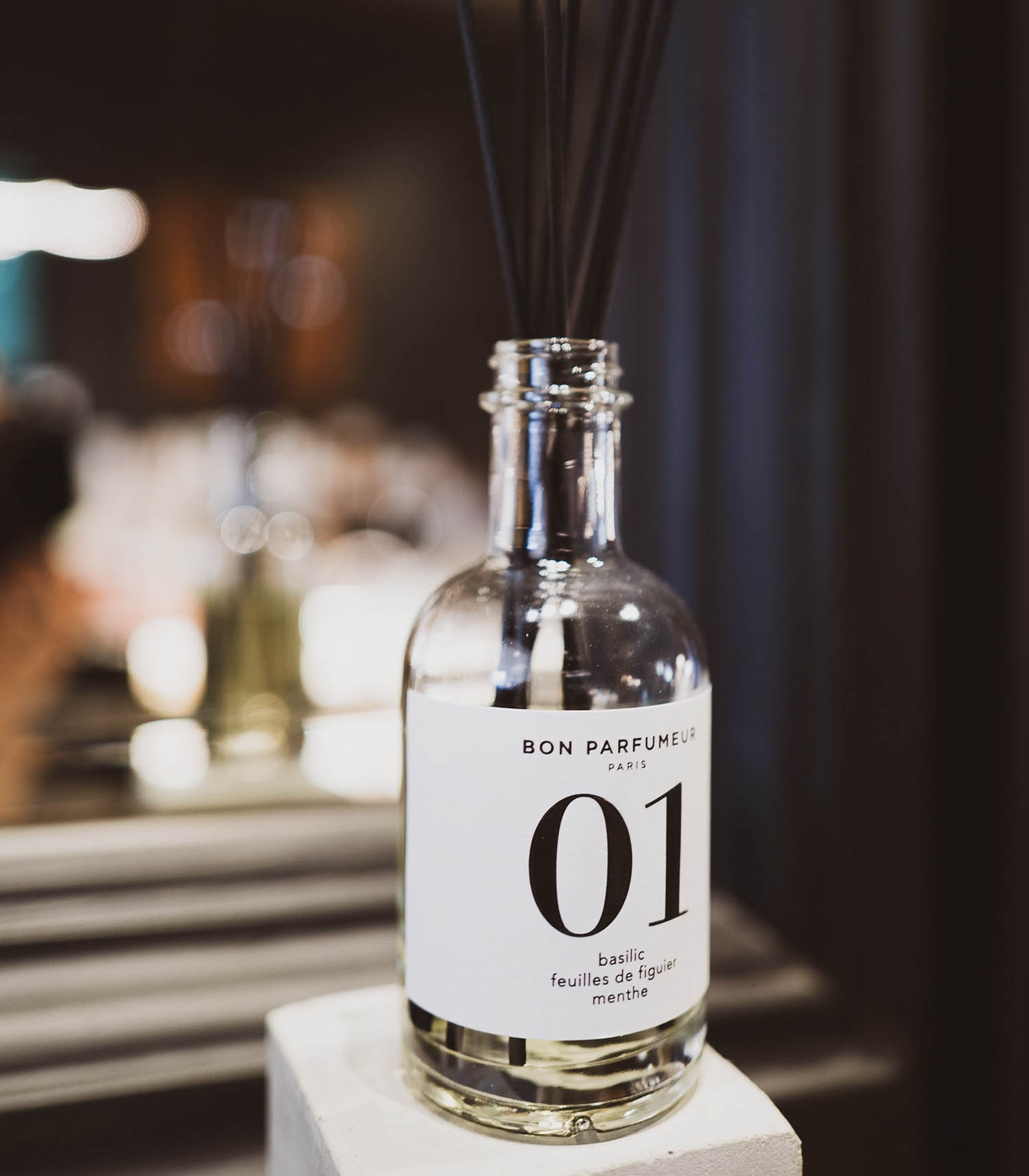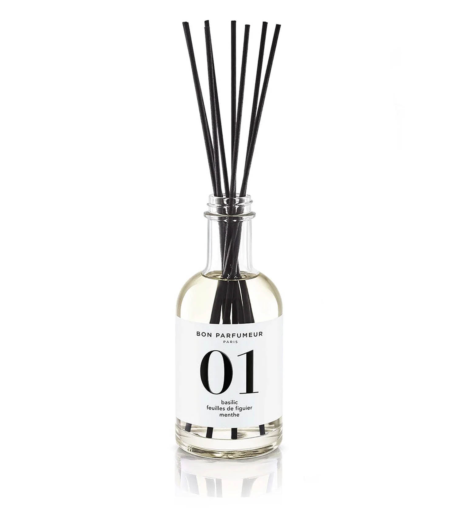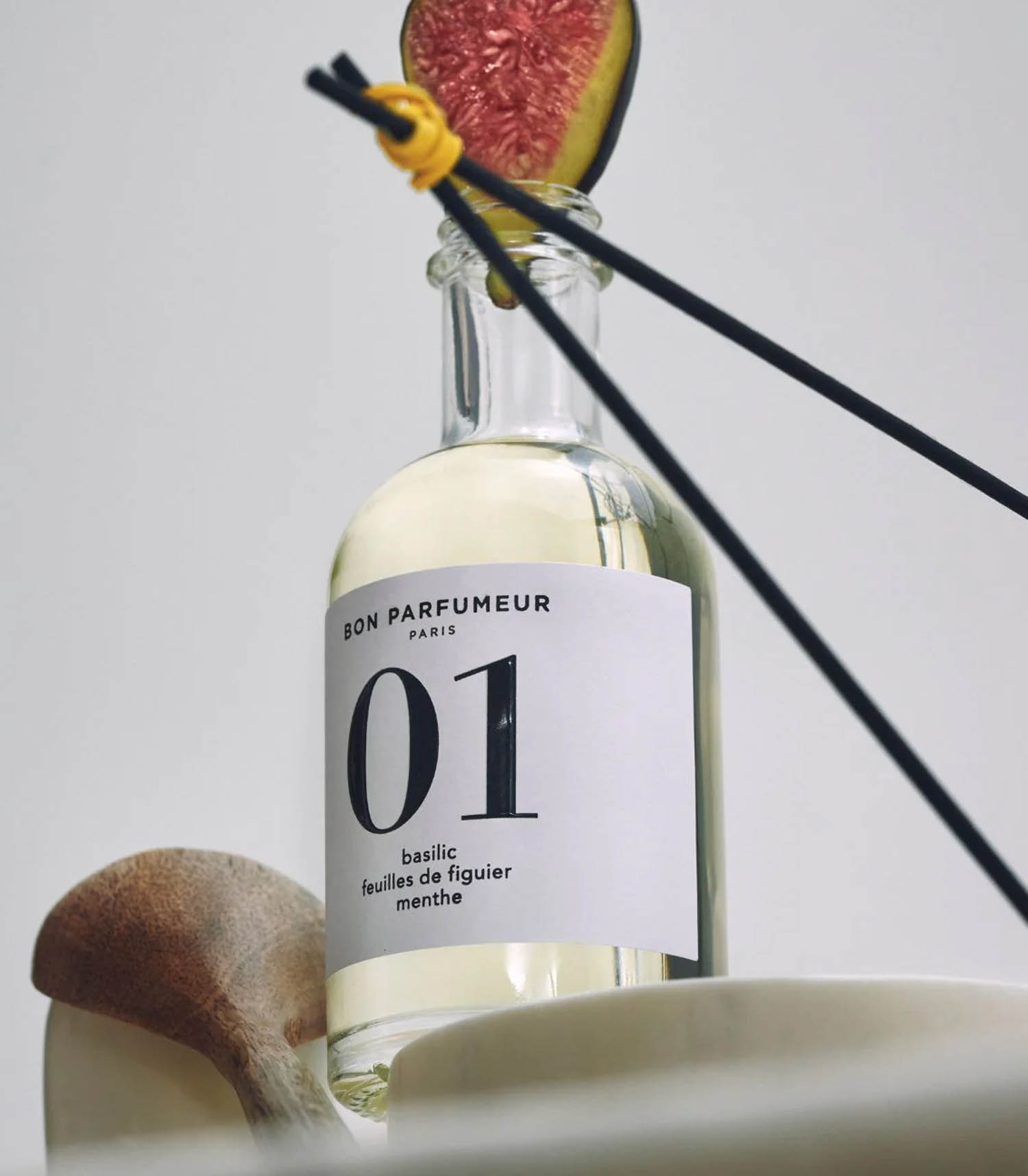 Diffuseur de parfum d’intérieur signé Bon Parfumeur, composé de basilic, feuilles de figuier et menthe, supposé évoquer une ambiance à mi-chemin entre l'aube et le crépuscule, baignée dans un vent de méditerranée.