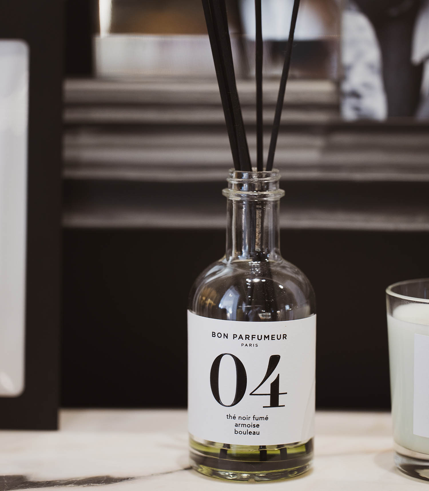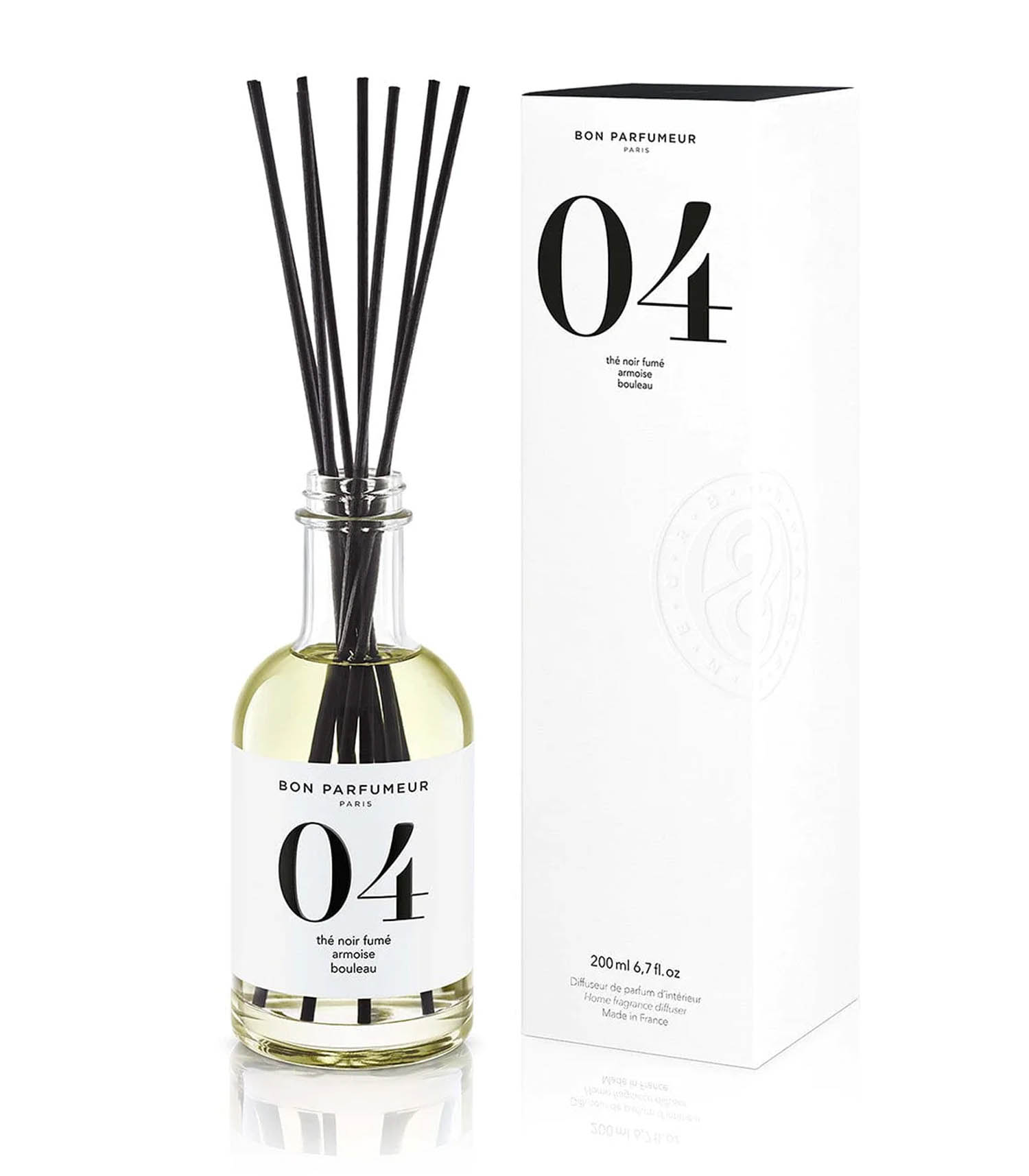 Diffuseur de parfum d’intérieur 04 Bon Parfumeur, au thé noir fumé, à l'armoise et au bouleau. Une fragrance enivrante qui évoque les prémices de l'automne, lové devant une cheminée fumante, un thé à la main, ou encore dans une fabrique de céramique fumante au japon.