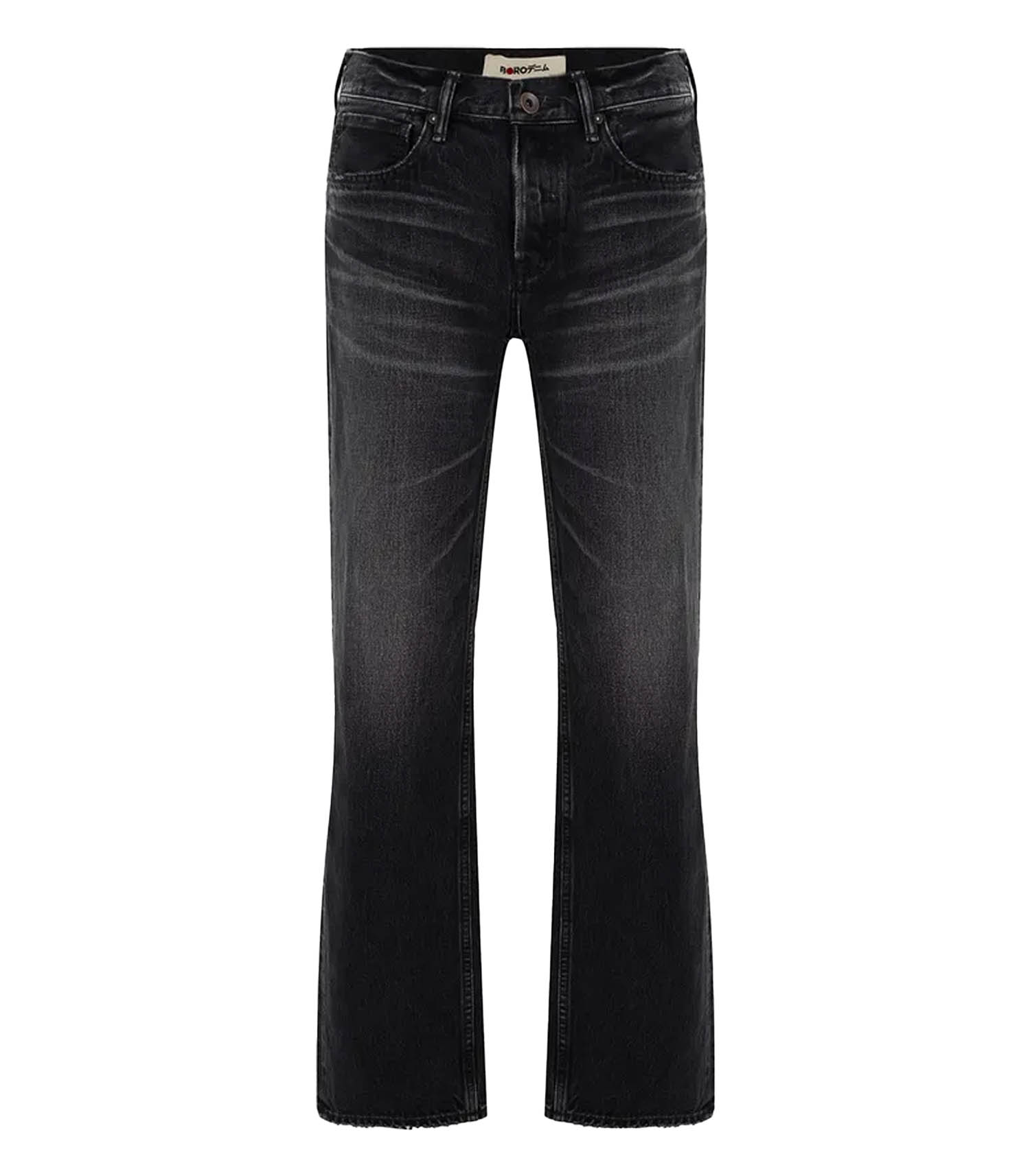 Jean brut noir à 5 poches coupe droite avec moustache au niveau des poches sur le devant. Fermeture à boutons.