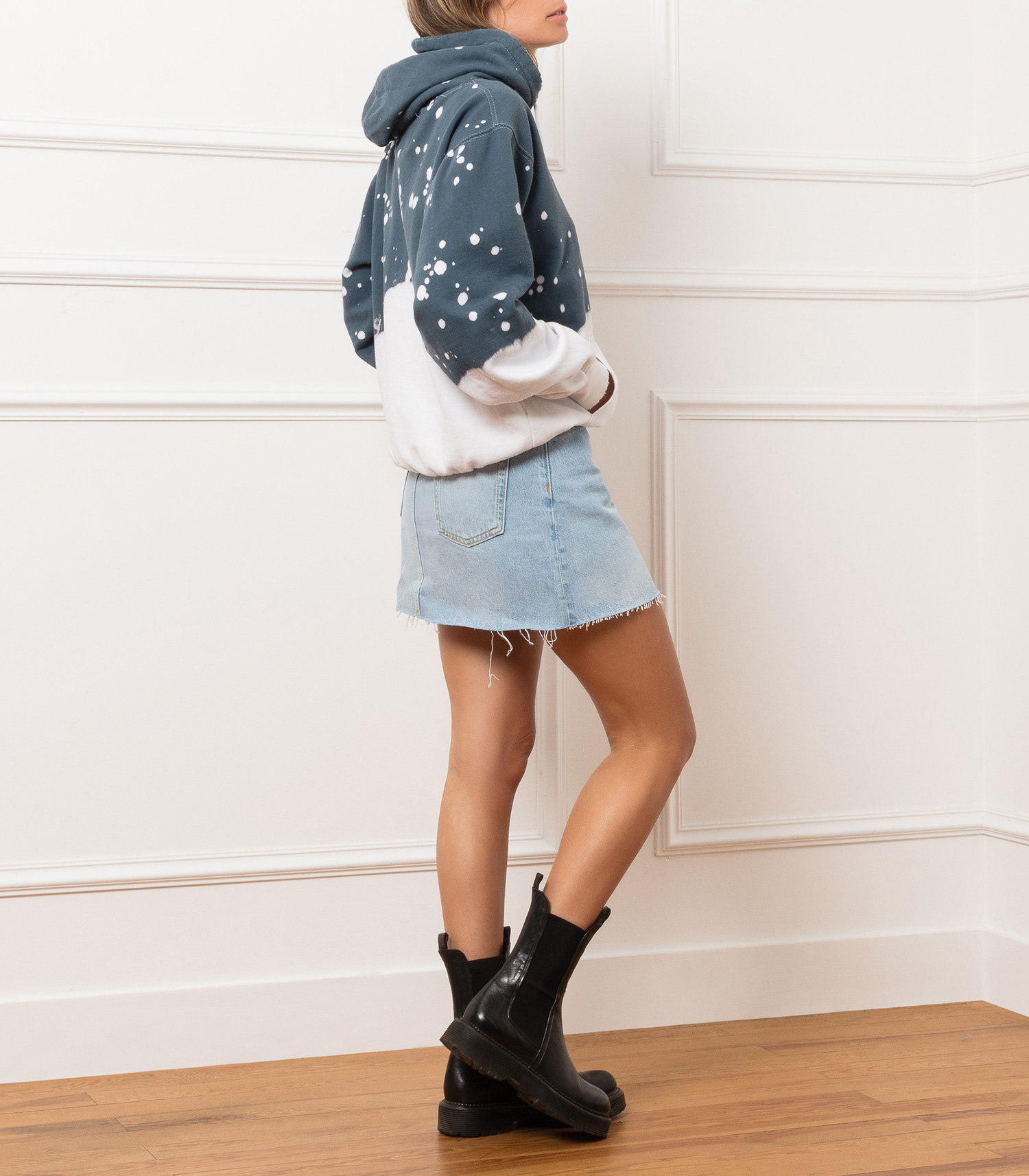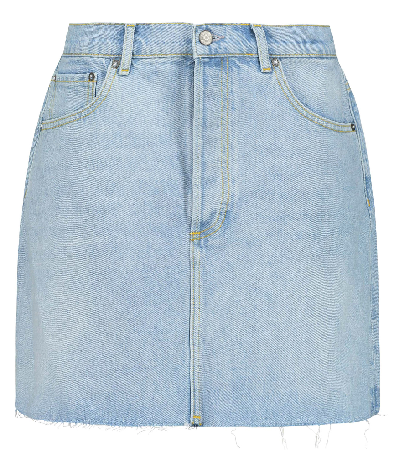 Jupe en jean The Corey signée Boyish, en hommage à la jupe signature de Mary Quant. La Corey Sunrise est une mini-jupe rigide dans un délavage indigo léger avec un ourlet brut.