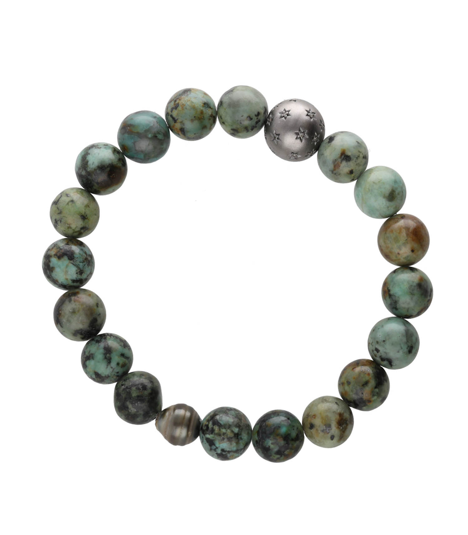 Bracelet Big Planet de la marque Catherine Michiels. Conçu en grosses perles de turquoise africaine, ce modèle comprend en son centre une perle métallique gravée de petites étoiles serties d'un éclat de diamant. Modèle élastique à enfiler.