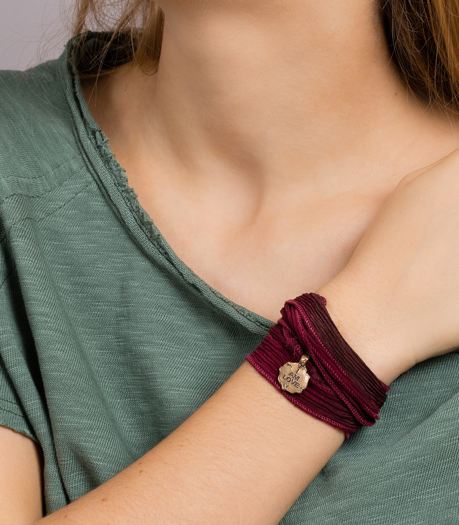 Bracelet en soie à nouer et charm I Am Love en bronze