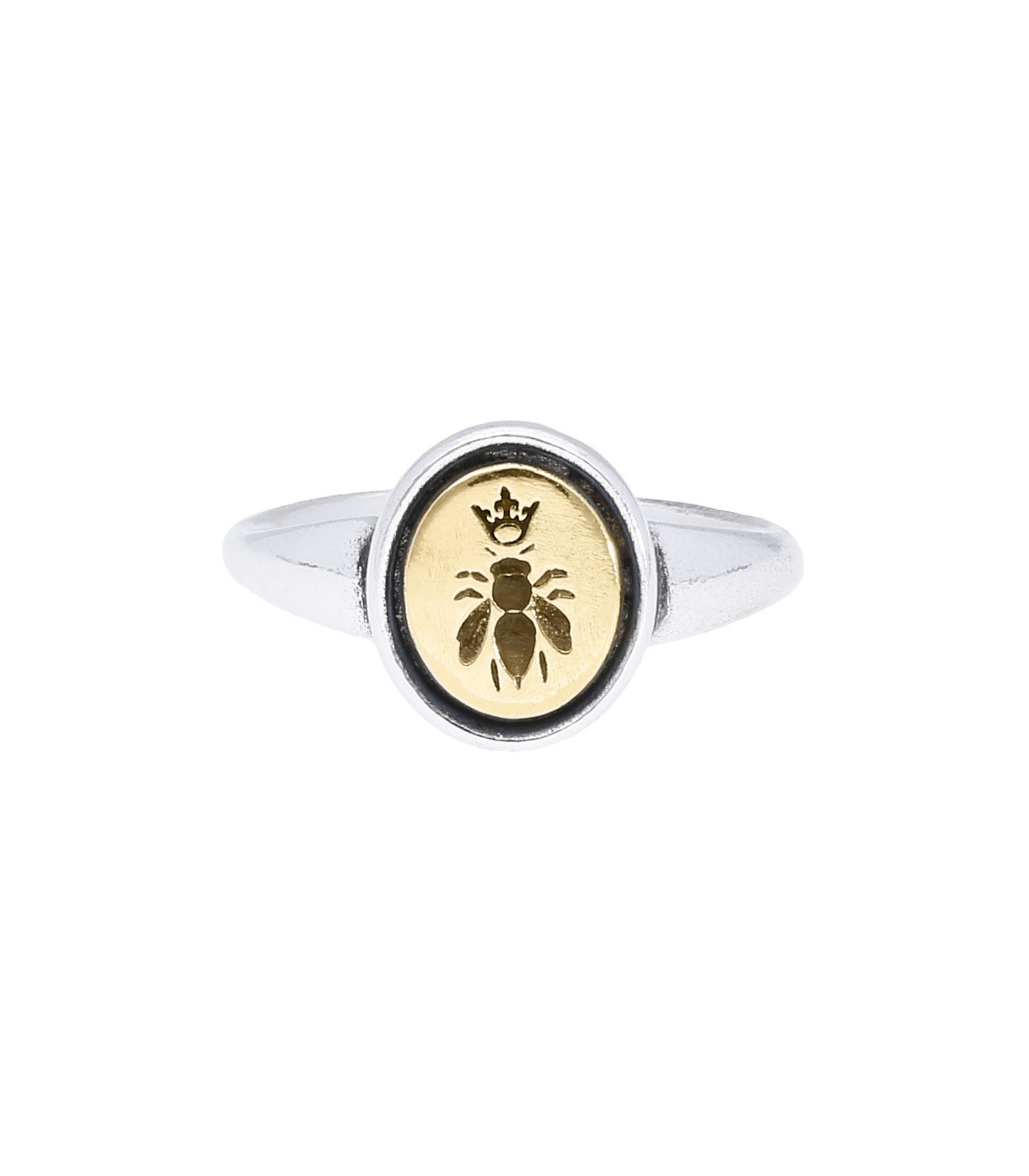 En argent et en or, la bague Dynasty de Corpus Christi fait revivre les symboles traditionnels. Cette chevalière est surmontée d'une plaque en or rehaussée d'une abeille et d'une couronne.