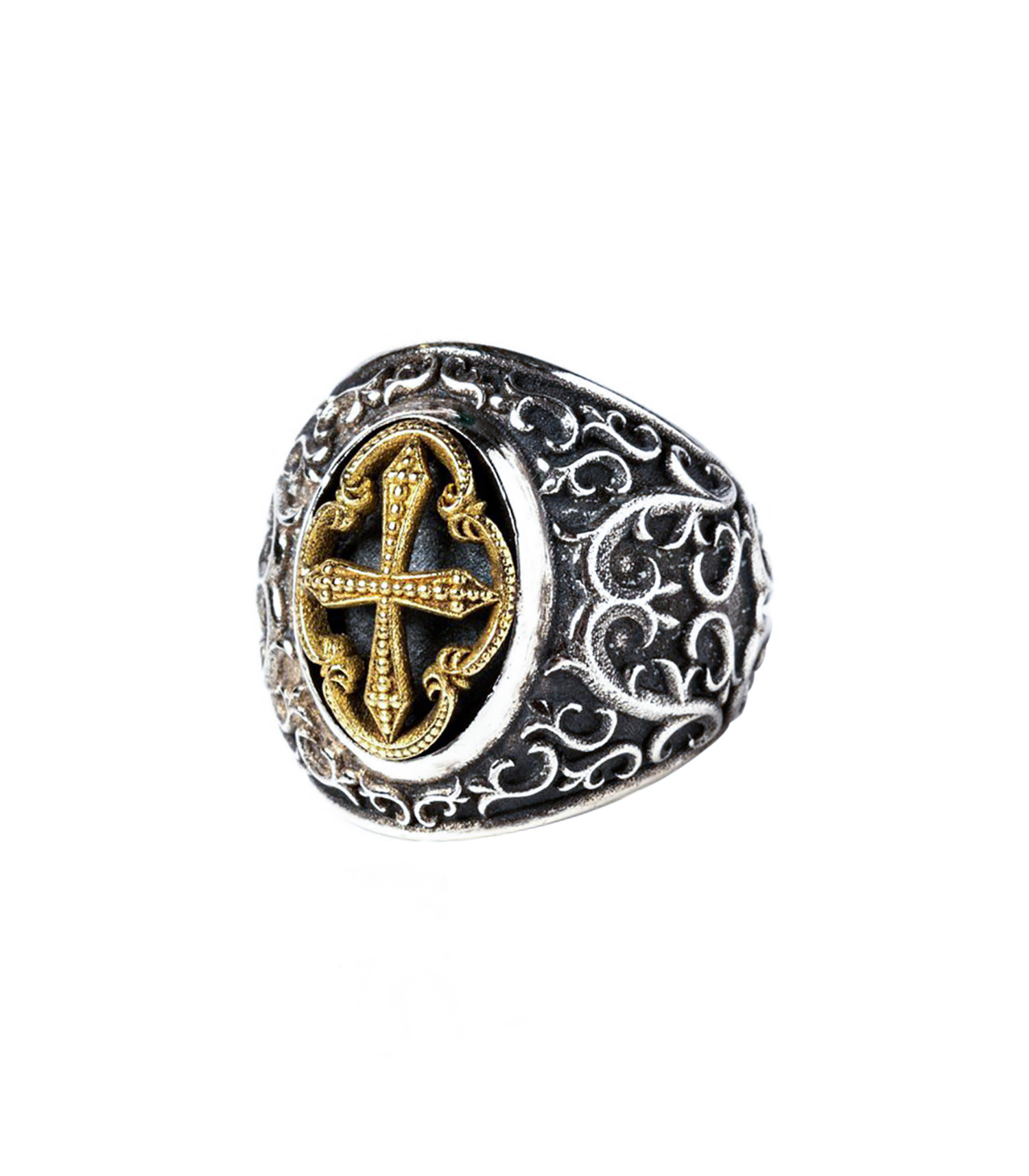 La bague Idylle en argent et or de Corpus Christi ne pourra plus quitter votre doigt. Ses arabesques sophistiquées et sa croix grecque mêlent les inspirations rock et ésotériques.