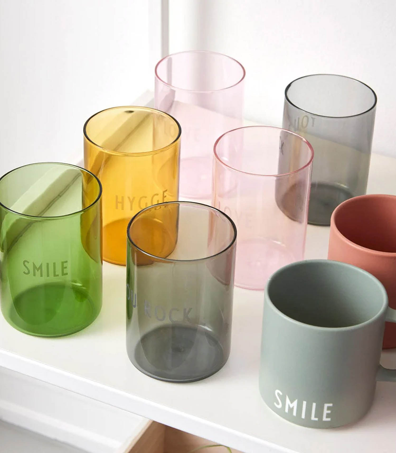 Verre Favorite Drinking Glass Hygge Yellow de la marque Design Letters, de forme cylindrique droite en verre jaune foncé, agrémenté d'un wording gravé "HYGGE" sur le devant.