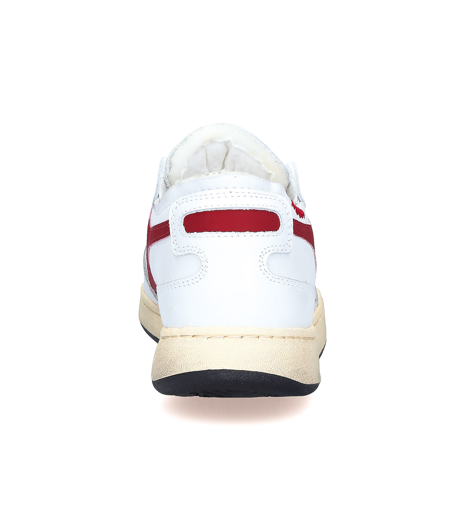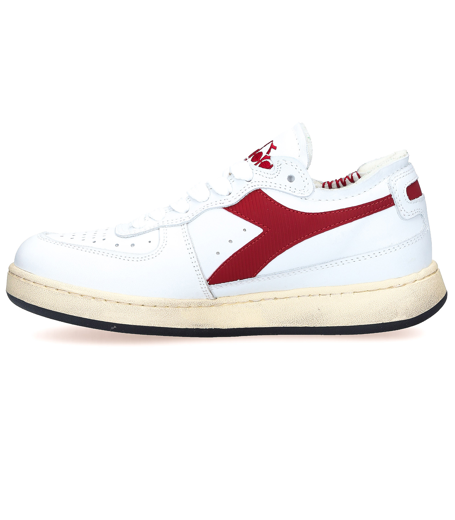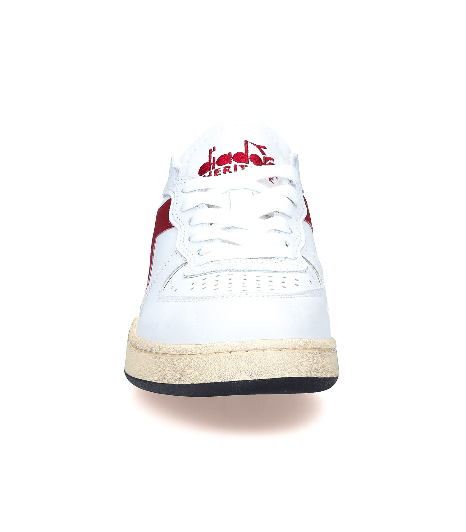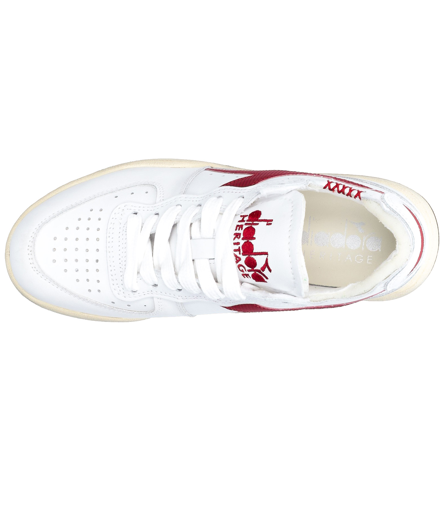 Basket Heritage MI Used Row Cut signée Diadora, modèle décliné de la MI Basket, avec une forme basse et des coupes apparentes. Elle présente des lignes graphiques épaisses et rouges sur la tige.