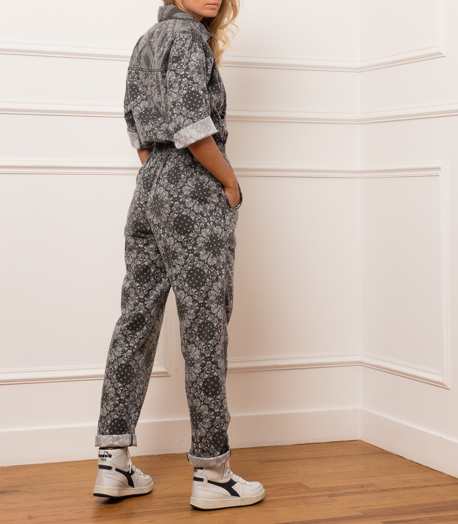 - Détails usés volontaires et tâches brunes signatures de la marque sur le modèle