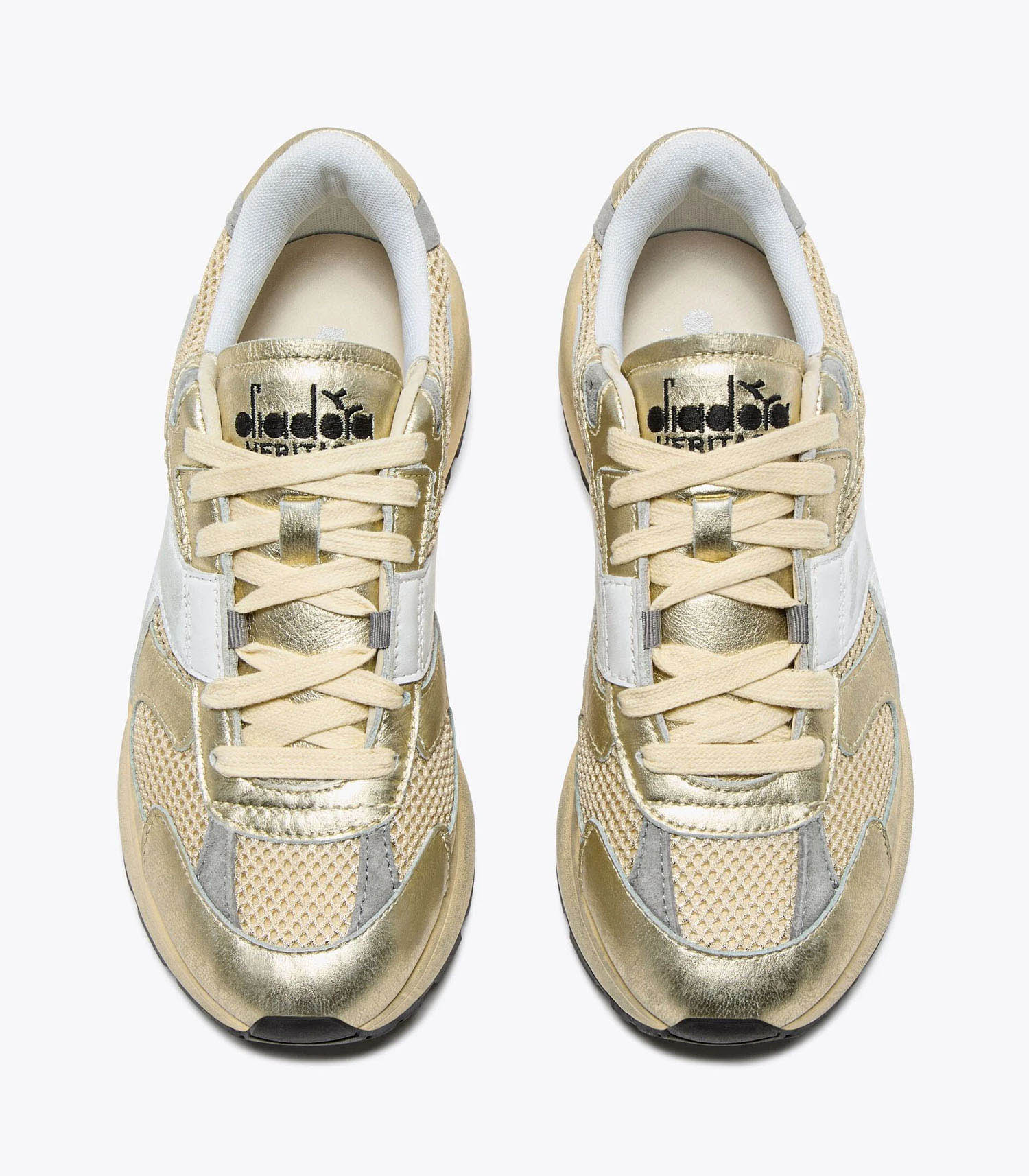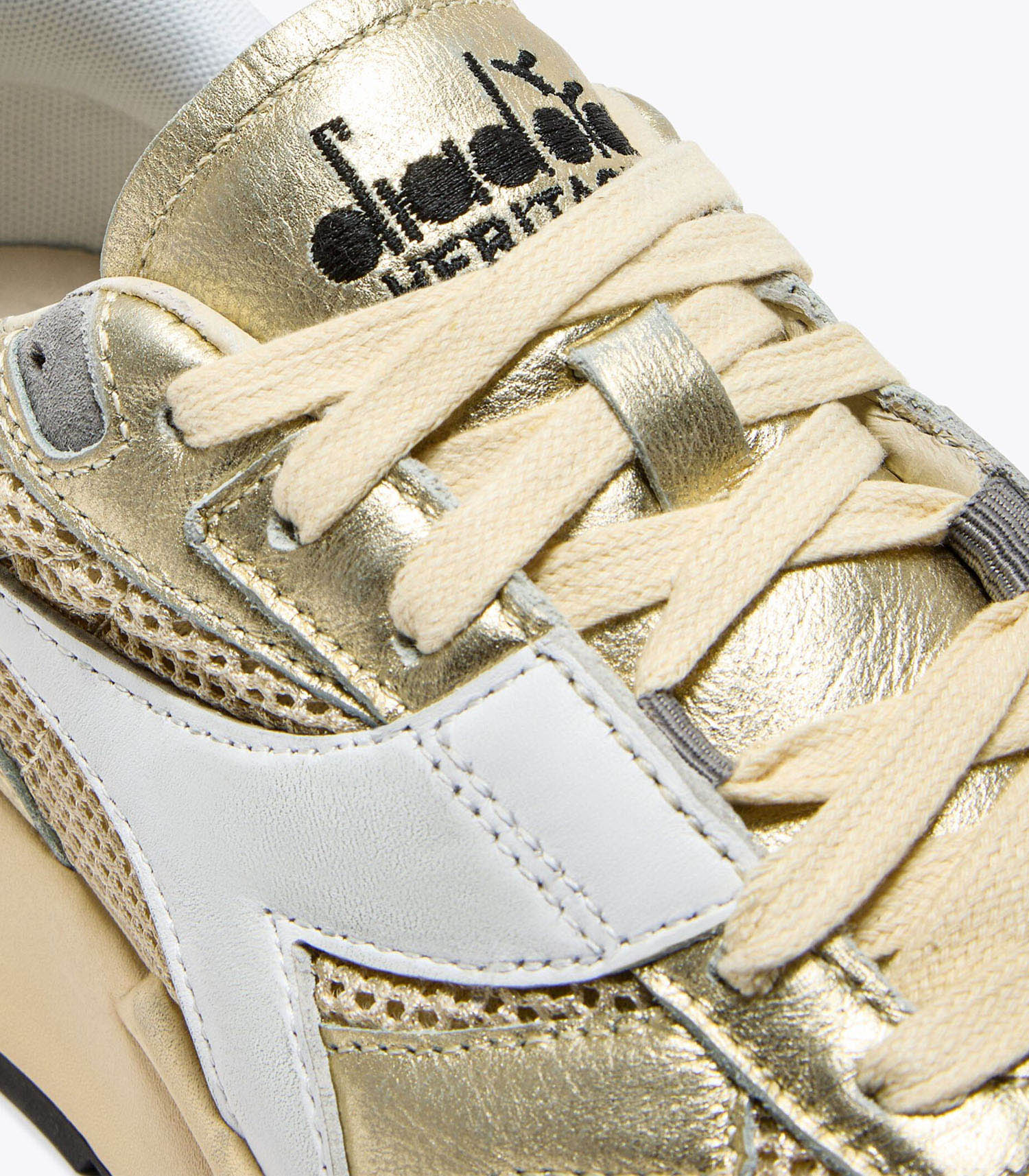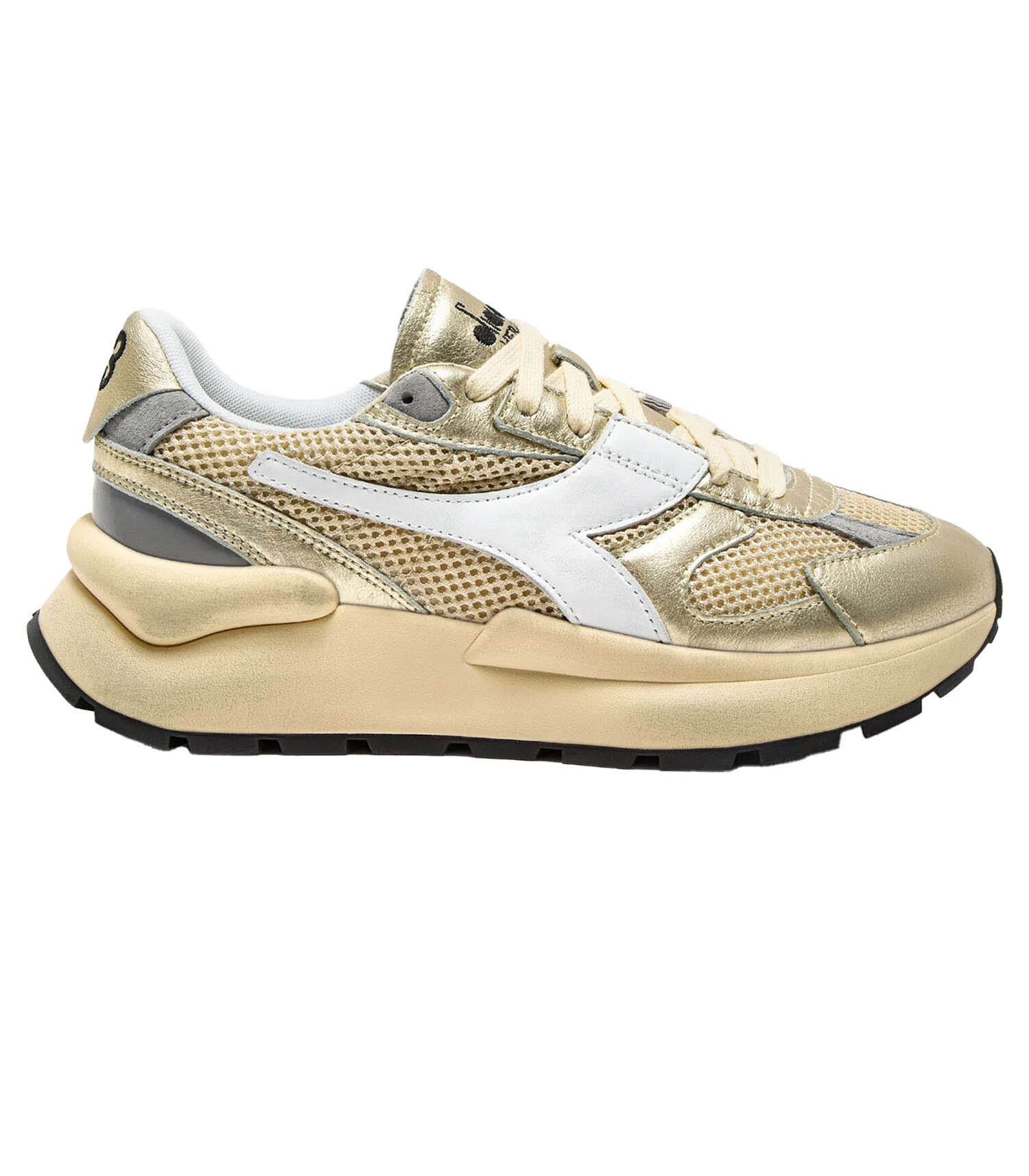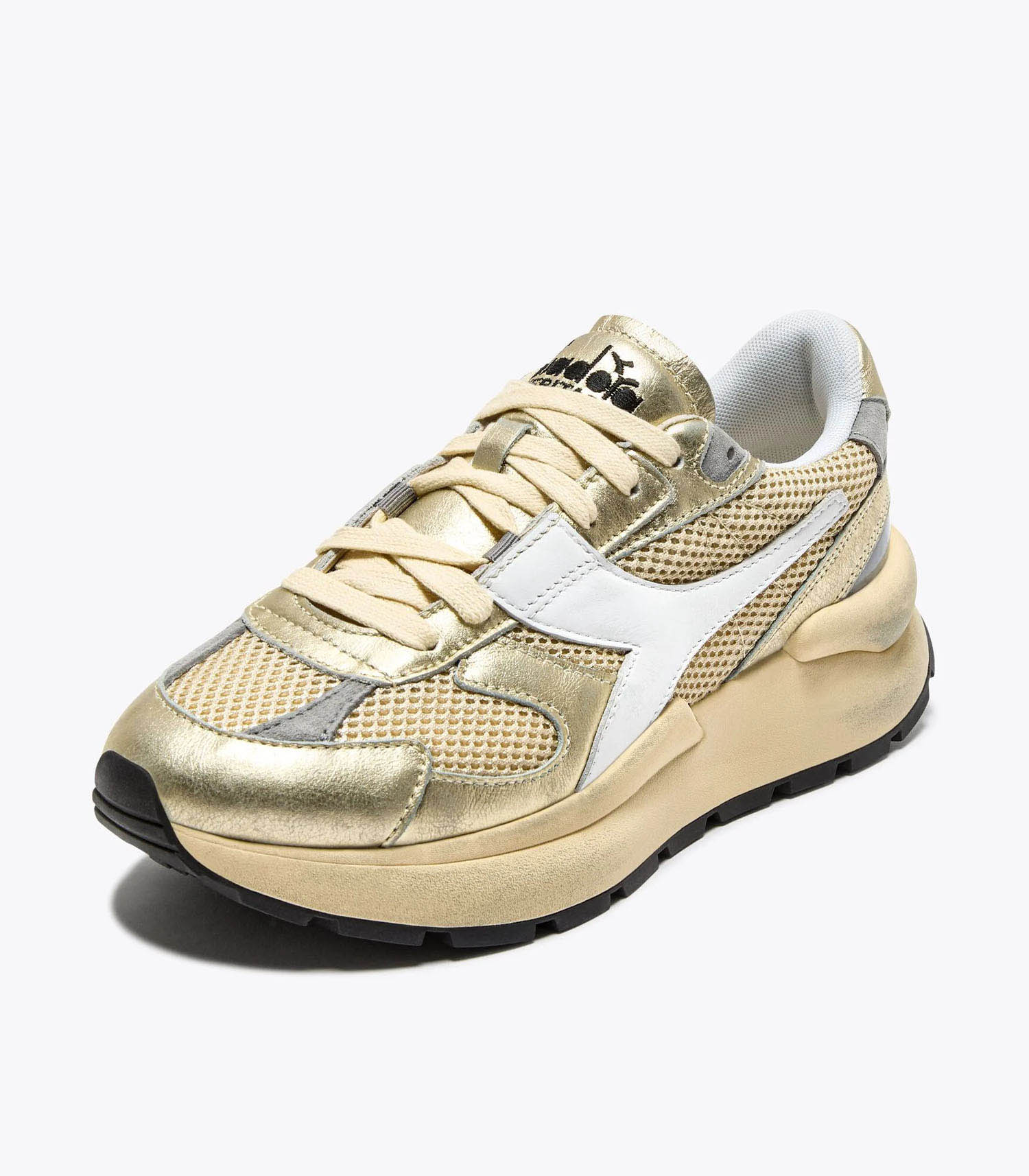 Baskets Mercury Elite Lam Camomille de la marque Diadora. Inspirée des chaussures de piste de la fin des années 70, la Mercury Elite Lam Used fusionne héritage rétro et esthétique contemporaine. L’empeigne mêle mesh métallisé et cuir lamé dans un coloris gold éclatant, tandis que le stabilisateur oversize ancre la silhouette dans un design résolument moderne.