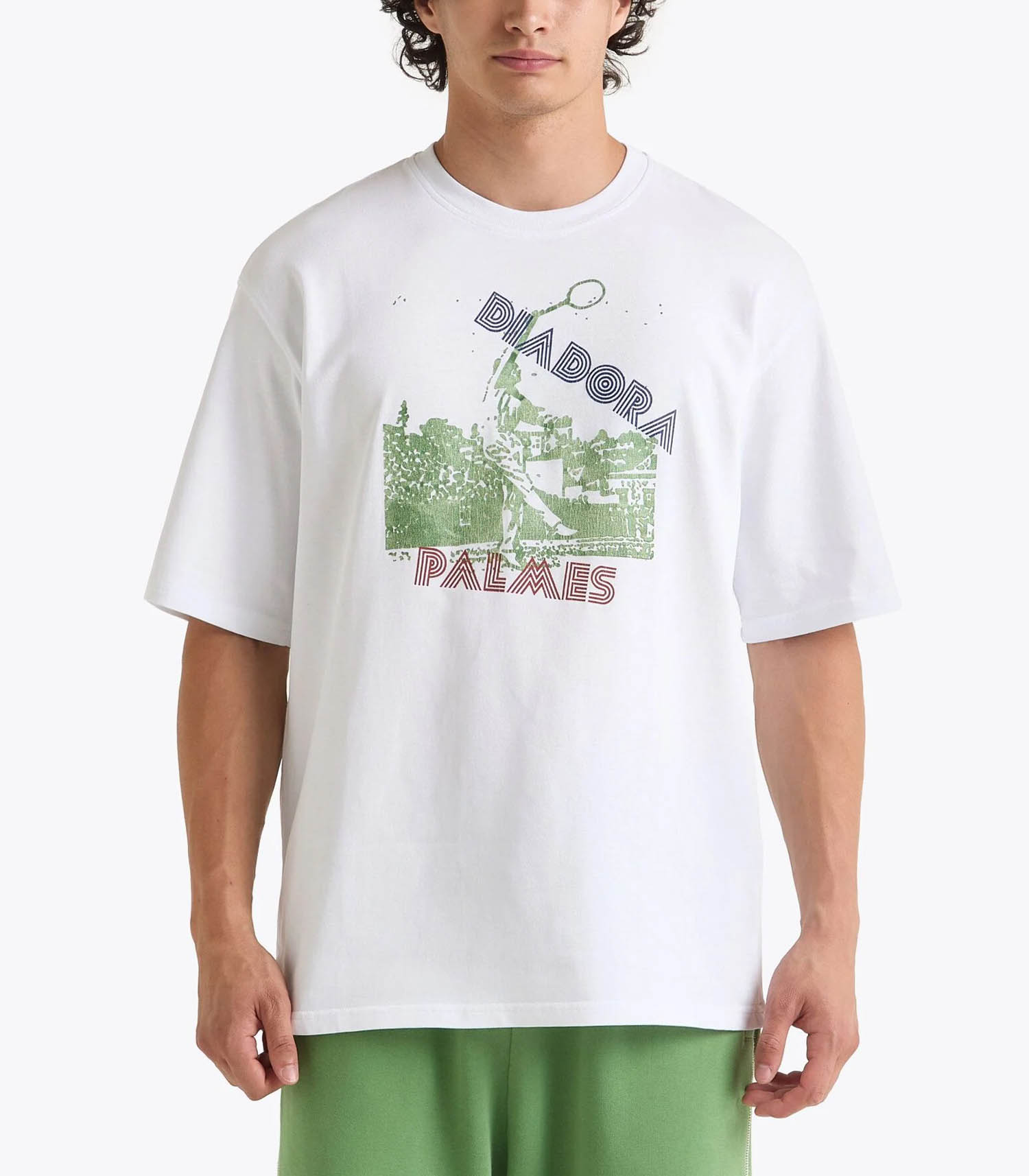 T-shirt SS Legacy blanc vif de la marque Diadora. Le t-shirt Legacy 100 % coton 220 grammes s’agrémente d’un imprimé sérigraphié issu des archives de la marque pour célébrer la collaboration entre Diadora et Palmes. Encolure ras-du-cou et coupe loose, avec de larges manches qui tombent parfaitement sur le corps, pour un style naturellement décontracté. L’étiquette griffée célèbre le partenariat exclusif entre les deux maisons.