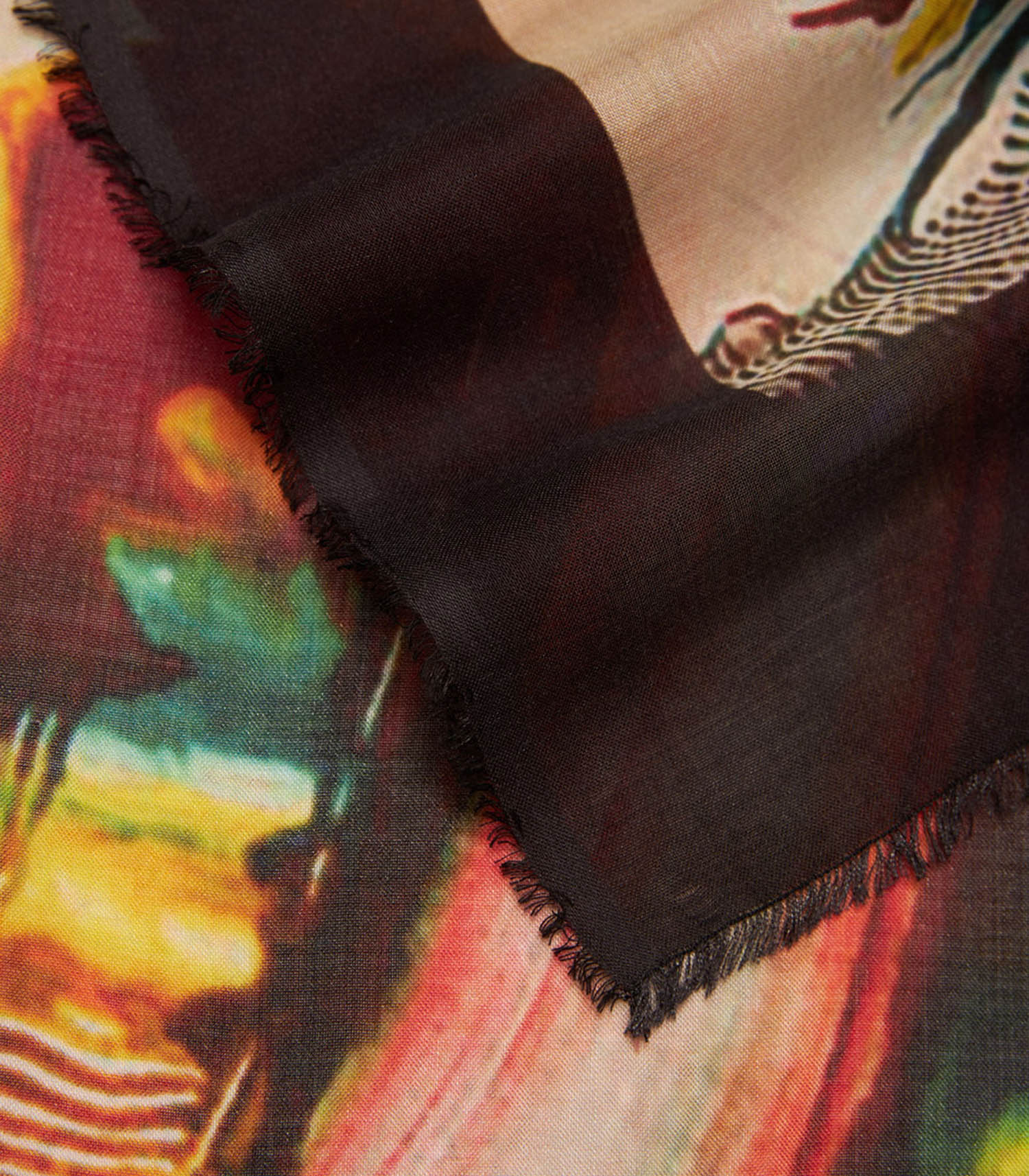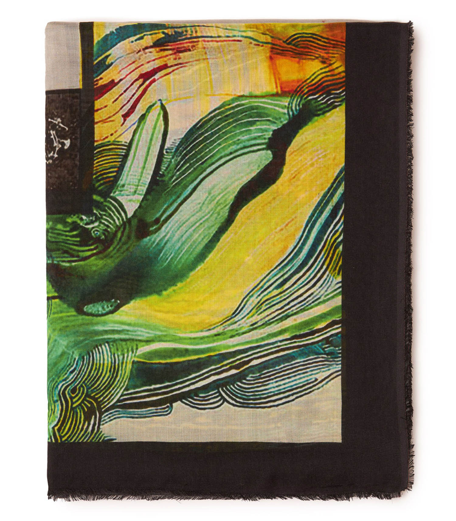 Etole Black Rhino de la marque Faliero Sarti. Peter Beard, artiste solicité pour réaliser le design de cette étole, réutilise ici le rhinocéros, élément récurrent dans ses créations. Cette photographie emblématique, prise dans le parc national d'Aberdare au Kenya, exprime l'authenticité de la nature. L'utilisation de l'aquarelle sublime le cliché. Encadré d'une bordure noire, le tissu en soie confère à l'œuvre une texture, une douceur et un confort agréables.